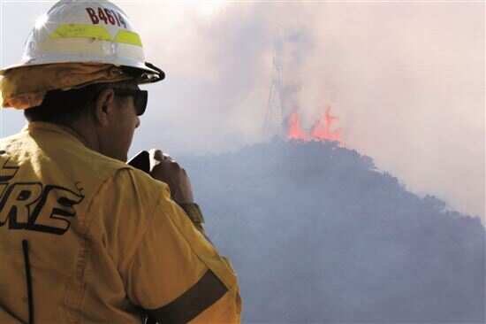 ■1月11日,消防员在一座山丘顶部观望野火火势。 |