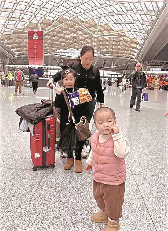 昨天,一年一度的春运如期而至,人们从不同的地方出发,满载着对未来的美好憧憬,纷纷踏上归家的旅程。新快报记者分赴广州站、广州南站、广州东站等交通枢纽,为你展现春运首日的一张张春运脸谱。 脸谱1 ●田阿姨 重庆人 奶奶独自带两孙子回家乡 乘高铁回家过年啦!我叫田小英,今年50岁,带着7岁的孙女、2岁的孙子坐高铁回重庆。孙女孙子名字叫蹦蹦、跳跳,我拉一个行李箱,姐弟两人也拉一个行李箱,他们的行李箱装的都是零食,弟弟个子小,也抢着拉行李箱。 我的儿子媳妇和女儿都在广州工作,儿子媳妇把家安在广州增城,生了二胎后忙不过来,因此这两年多我就在广州帮忙带孙子。 儿子媳妇工作忙,要临近过年才回。小孩子放寒假了,我就先带着两个小孙儿回去,爷爷在老家等着我们了,他把过年吃的喝的都准备好了,盼着两个可爱的小孙儿回去。 刚开始儿子媳妇有点不放心,担心春运期间人多,我顾不过来两个孩子。我说,这几年我几次往返广州和重庆,来广州南站坐车也不是第一次,一人带两个孩子没有问题。 实际上,30多年前我就在哈尔滨打工,每年春节前都要坐火车回重庆,经历过很多次春运。90年代,那时坐的是绿皮火车,要坐48个小时才能回到家,那时春运人是真多,火车站人多,火车车厢里很拥挤,就连过道都挤满了没有座位的人。现在条件好多了,广州回重庆高铁仅需要7个小时,而且全程很舒适。以前回家都是大包小包带很多行李、年货,现在都是轻松出行,带几件换洗衣服就够了。 现在高速公路也好走,儿子女儿准备过年前开车回家。等过完年回广州,就装上一些自家种的大米,老家的腊肠、腊肉、面条,把家乡的风味带到广州。他们在广州生活多年,逐渐适应这边的生活,但不变的还是口味。 春节到了,我祝大家新年快乐!希望两个孙儿健健康康,儿子媳妇工作顺利,大家新一年都生活美满幸福! 脸谱2 ●刘先生 江西上饶人 特别期待能见到刚出生的外甥女 我老家在江西上饶,现在在广州从事化工行业。这已经是我在广州工作的第七个年头了。因为工作忙碌,一年最多只能回家两次,通常是春节和国庆。今年由于公司提前放假,工作暂时告一段落。因此,我趁着春运第一天,带着妻子和4岁的孩子早早踏上了回家的旅程,正好可以避开春运的高峰。 我们从广州东站出发,坐11点40分的高铁到南昌,然后再转车回上饶,整个路程大概需要六个小时。虽然旅程不算短,但想到很快就能见到父母和家人,心里特别激动。 我的孩子今年4岁,一直和我们住在广州。平时孩子和爷爷奶奶见面的机会不多,这次带他回去,既是让他感受一下家乡的过年氛围,也希望他能多陪陪老人。孩子一路上都很兴奋,问个不停,满心期待地想见到爷爷奶奶。 今年回家,我还有一件特别期待的事——我的妹妹刚生了一个小女儿,我早就盼着能见到她了。这次回去,终于可以抱抱她了,别提有多高兴了。 对于今年春运的体验,我觉得比往年更顺畅。我们提前在网上买了票,刚好是春运第一天,没怎么遇到抢票的麻烦。车站秩序也很好,整体体验非常轻松。现在的春运服务越来越人性化,尤其是线上购票和进站效率的提升,让出行变得更加便捷。 新年将至,我的愿望很简单也很质朴:希望新的一年工作顺利,能挣更多钱,让家人生活越来越好,最重要的是家人都平平安安。对我来说,回家的路虽然远,但每一步都满怀期待,也满载幸福。 脸谱3 ●贾阿姨 湖北天门人 在粤务工30载,春运路上看变迁 1996年,我从湖北天门来到广东,成为了一名制衣女工。这近30年里,我先后在汕头、广州、东莞工作。2020年,我随着工厂从广州搬到了东莞。 这近30年,每年春运我都在广东和湖北之间往返,这一趟趟归乡之旅,也让我见证了交通网络的巨大变迁。 过去,交通条件有限,长途大巴和火车陪伴了我的回家路。那些年坐火车,要是没买到坐票,就只能将大包小包背在身上,一站就是一路。2008年的春运,更是让我至今难忘。那年春运遇上雪灾,我在汕头工作,虽然早早买好了车票,但由于火车大面积延误,火车站里人山人海,连候车室都挤不进去。我在火车站外面一等就是十几个小时,加上汕头到湖北的路途远,火车又行驶得缓慢,前前后后几天几夜才到家。 而现在,地铁、高铁、城际接连开通,回家之旅变得轻松了许多。春运首日,我早上七点多起床,简单吃过早餐,收拾好行李出发。九点多,在东莞坐上广东城际列车,看着窗外的景色飞速掠过,一个多小时后便抵达广州南站。下午一点左右,乘坐武广高铁一路北上,预计傍晚五点左右就能到达武汉。接着,晚上八点换乘到天门的动车,到站后打车,预计晚上十点多就能推开家门,看到许久未见的亲人。全程十几个小时,相比普速火车速度快了不少。 春节是一家人最珍贵的团聚时刻,尽管我们一家人分散在湖北、广东和北京各地,但都会想尽办法回家团圆。儿子和女儿的假期短,在家没能待几天就得各奔东西,我自己年后也要回到广东继续工作。相聚的时光每一刻都格外珍贵。 新的一年,我希望全家人都能平平安安,父母身体健健康康,阖家欢乐,幸福美满。 脸谱4 ●只女士 河北唐山人 “到大湾区旅行,春节前把福气带回家” “我和老伴在广东玩了十多天了,准备搭高铁去下一站——武汉。”我叫只艳丽,今年63岁,河北唐山人。我以前是一名护士,老伴在铁路工作。我们夫妻退休了,喜欢到处游玩,