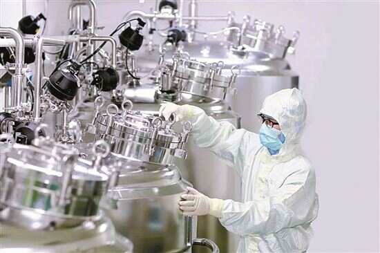 ■工作人员在生物制剂生产车间配液。(资料图)新华社发 |