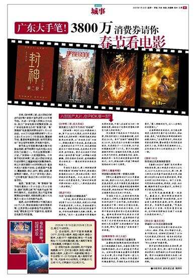目前,《封神第二部:战火西岐》《蛟龙行动》等六部影片宣布进军2025年春节档。为进一步丰富人民群众文化生活,助力广东省电影市场繁荣发展,由广东省电影局主办的“影惠万家,‘粤’享精彩”电影惠民消费活动于1月19日启动。3800万元电影消费券将于1月19日至8月31日分三个阶段发放,覆盖春节档、暑期档等重要档期,使用范围包含广东全省所有影院、所有影片场次。 春节是全年观影需求最为集中的黄金档期,春节档票价也成为观众关注的热门话题之一。作为全国票房第一大省,广东拥有一大批观影群体。今年春节档《封神第二部:战火西岐》《蛟龙行动》《哪吒之魔童闹海》《射雕英雄传:侠之大者》《唐探1900》和《熊出没·重启未来》六部影片定档,全部是国产电影IP,覆盖喜剧、奇幻、动作、冒险、动画、悬疑等多个题材。不少广东年轻人表示,“过年看电影”是自己和小伙伴们的必备项目。 据悉,“影惠万家,‘粤’享精彩”春节档优惠券从1月19日至2月28日派发,提供“购票立减”和“电影代金券”两种优惠形式。活动期间,观众可登录淘票票活动专题页,领取购票立减10元优惠及10至20元的电影代金券。 据悉,此次消费券预计可惠及超过200万人次,将有效提高大家的观影热情,让更多观众在新春佳节走进影院,体验“看电影过大年”的新年俗,畅享来自电影艺术的普惠。 六部国产大片,你PICK哪一部? 《封神第二部:战火西岐》 真实建立九百万平方米的“西岐城” 《封神第一部》于2023年暑期档上映,拿下26.36亿元票房,位列年度票房榜第五名。《封神第二部》续写姬发刺杀殷寿后的故事,以“西岐保卫战”为核心,将镜头聚焦于西岐城,真实建立起一座面积达九百万平方米、标志建筑物超过五十栋的西岐城,也呈现出更多的战争、动作场面。影片还让流传千年的神话人物和异兽“成真”,四蹄踏火的墨麒麟、身形迅猛的花狐貂、盘旋翻腾的青云剑蛟龙……曝光的预告画面极具想象力。 导演乌尔善表示,第二部剧情故事将特别聚焦“封神榜”的争夺,特效镜头数量超过2000个,将为观众再现一场史诗般的战争盛宴。不过,他表示,影片的核心还是塑造角色,“神话史诗电影所探讨的核心还是人,人类的危机要由人类去解决。” 《蛟龙行动》 打造“全球最大的潜艇道具” 七年前,现代军事战争片《红海行动》拿下36.51亿元票房,收获2018年春节档票房冠军,七年后,导演林超贤大胆破冰,携续作《蛟龙行动》再登春节档,开创性地将潜艇大战搬上银幕。林超贤称,“我们一直在探索对军事题材电影的突破,中国人应该有自己的一部潜艇电影,相信这个电影的质量绝不辜负大家七年的等待。” 作为聚焦于海战和水下作战的电影,《蛟龙行动》1:1打造潜艇四艘,总长度达231米。其中“龙鲸号”潜艇置景长达120米,这也是迄今全球最大的潜艇道具,长度相当于一个足球场,仅外壳的搭建就花费了8个月。影片不仅捕捉潜艇内部惊心动魄的实战交锋,也呈现出单兵飞行背包、新型瞄具步枪、航母、舰载机等一系列尖端武器装备和彩蛋设计。此外,剧组还精心构建了跨越深海陆地的50余个大场景。 《哪吒之魔童闹海》 特效镜头数超过第一部镜头总数 《哪吒之魔童降世》于2019年暑期档上映,票房50.35亿元,既是2019年年度票房冠军,也是中国影史票房最高的动画电影。《哪吒之魔童闹海》重新解构传统故事,讲述传统的“哪吒闹海”故事在重塑肉身后未完的少年成长。 导演饺子表示,在保持前作风格的基础上,《哪吒之魔童闹海》在剧情和制作进行了全面升级,仅特效镜头数就超过了第一部的全片镜头总数,尤其是哪吒与敖丙的战斗场面,力求将中国动画电影的奇幻色彩发挥到极致。整部电影的制作也颇具东方质感:章鱼将领的铠甲、鲨鱼将领的牙齿均用了东方常用的曲线元素;珠光流转的七色宝莲将“五彩斑斓的白”具象化呈现,哪吒“莲池重生”名场面有了画面感。 《射雕英雄传:侠之大者》 徐克时隔31年再度操刀金庸经典 金庸经典《射雕英雄传》的影视作品已经拍摄诸多版本,此番徐克操刀的《射雕英雄传:侠之大者》备受外界关注。这部电影改编自金庸同名原著第34至40章,是今年春节档唯一登上大银幕的武侠电影。时隔31年再度操刀改编金庸作品,导演徐克如此形容这部影片,“震人肺腑的侠气,让人心动难忘的浪漫情义。” 出演郭靖的肖战表示,自己能在郭靖身上找到许多属于自己的特点,例如执着、善良,“我觉得我和郭靖的精神内核最为相似。”在电影预告中,传统武侠形象也有创新,譬如黄蓉不再是娇美俏皮的大小姐,华筝不再是温婉的公主,各色戏班与洪七公的造型也让人耳目一新。 《唐探1900》 陈思诚这次要搞搞新意思 《唐探1900》为“唐探”系列的第四部院线电影,前三部票房分别为8.23亿元、33.97亿元和45.23亿元,第二部、第三部均为当年春节档的票房亚军。《唐探1900》作为该系列电影的前传,带观众回到1900年的旧金山。除了王宝强、刘昊然两位老搭档,周润发、白客、岳云鹏、魏翔等演员也加盟该片,或将吸引更多影迷走进影院。 这次陈思诚邀请戴墨一起执导。戴墨表示,第四部将延续前作“喜剧+推理探案”的独特风格,依旧会有大家熟悉的喜剧、动作、悬疑类型元素。导演陈思诚透露,“阿鬼和秦福是为王宝强、刘昊然量身打造的,这对新的侦探组合打破