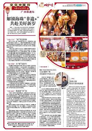海珠,一个珠水环绕、应水而生的宝岛,承载着悠悠岁月。广州市海珠区拥有人类非物质文化遗产代表作1项,国家级非遗项目3项,省级、市级和区级非遗项目15项、28项和54项。当首个世界非遗版春节,碰上海珠“非遗+”的N种打开方式,会有什么新景象? “非遗+节庆” “热”闹迎新春 春节(行花街),是广府地区春节前夕的一项传统民俗,也是国家级非物质文化遗产之一。锣鼓声响,醒狮起舞,拉开了海珠千年花洲迎春花市的热闹喜庆大幕。海珠区充分利用非遗资源,整合打造“行花街”传统民俗品牌,为市民打造了有年味、有底蕴、有情怀的花市。 “非遗+节庆”让春节(行花街)这一国家级非遗绽放出新的光彩,也让市民沉浸式体验了一场年味十足的文化狂欢。步入花市,一边是非遗特色展示区,省、市、区等非遗传承人齐聚一堂,现场展示广彩、榄雕、蛋雕、泥塑、铜印等细腻精湛的非遗技艺。另一边,“花神”化着非遗仿妆,展示不同朝代的中华传统服饰,诉说着岁月更迭的故事,让观者仿佛穿越时空。花市还策划了趣味互动活动,让市民们有机会亲手体验非遗团扇制作,参与以“春节祝福、生肖属性、非遗年俗”为主题的绘画创作,用画笔勾勒出对新年的期盼,留下一段关于海珠区非遗与春节(行花街)结合的独特记忆。 “非遗+展销” 吉“物”贺新年 那些藏在非遗里的新年祝愿,同样为过年增添了别样的韵味。广彩的蛇年生肖瓷器、十二生肖挂饰等工艺品,凝聚着人们对生活的热爱与对未来的期许;广绣的《大吉大利》《锦鸡花鸟》《春晓》等精美绣品,是以细腻的针法,将自然的生机与生活的美好栩栩如生地呈现;竹报平安、步步高升、万事如意、一帆风顺、满载而归等美好的寓意,被工匠们巧妙地融入榄雕中…… 在“非遗+展销”模式下,非遗走进了人们的生活,成为新年里具有温度的文化记忆。广州榄雕区级非遗代表性传承人欧志平告诉记者,近几年,他们都会为花市雕刻一批生肖榄雕在花市上进行展销,“非遗展销给了传统文化和传统技艺充分展示的舞台,让更多街坊,也让来广州旅游的朋友深入了解岭南特色传统文化,亲身感受岭南非遗技艺的独特魅力。” 广州铜印制作技艺项目非遗传承人冯健辉表示,他每年都会紧跟市场审美趋势,推出新的铜印工艺品。今年,他用砂金抛光工艺,让铜印呈现出黄金般的色泽和质感,印上了“招财进宝”“财源广进”等吉利话语,受到市民的青睐。 “非遗+融合” 焕发新“活”力 “非遗+”也带来了新的消费业态。海珠区民间文艺家协会主席、广彩世家“赵兰桂堂”第四代传人赵艺明观察到,近年来,海珠区在非遗领域持续发力,不断挖掘新的非遗项目。在这个过程中,非遗交流活动越来越频繁,让大家有更多的交流,为各方合作带来新可能。赵艺明还提到,跨界合作已成为非遗发展的新趋势,以广彩为例,目前就有与汽车、饮食等行业展开合作的案例,为车企定制广彩图案设计,为餐饮企业定制广彩元素礼品用于馈赠客户等。 海珠区非物质文化遗产协会推出的“非遗手串”,由榄雕、海幢寺传说、打铜、泥塑、广彩、广绣、玉雕等13个非遗项目的大师监制,将不同非遗元素融合串在一起,寓意各项非遗项目“一起发光发亮”。 海珠区调动起了辖区内互联网企业的资源优势,将广彩、榄雕、素馨花等非遗带进琶洲人工智能与数字经济试验区的众多互联网企业中,激发了“非遗+数字化”的新活力。例如,三七互娱借助人工智能和元宇宙概念,把广府文化与非遗元素融入游戏,其旗下游戏《叫我大掌柜》,将醒狮、广彩、广绣、粤菜等非遗元素融入游戏场景,吸引了大批年轻人成为传统文化的忠实拥趸,助力中华文化“走出去”。 [海珠非遗故事] 粤绣(广绣)的代表性传承人伍洁仪: 42岁逐梦广绣 用热爱坚守传承之光 伍洁仪与广绣的缘分,始于儿时的耳濡目染。那时,海珠区新滘一带是名副其实的广绣基地,周边村落的女性大多以绣花为业。母亲精湛的绣艺,为她打开了广绣的大门,四五岁时,她就忍不住爬上桌子,拿起针线尝试刺绣。 长大后,尽管没有立刻投身广绣行业,但儿时种下的广绣种子和对美术的热爱,为她日后的广绣之路积攒了能量。42岁时,伍洁仪正式入行,进入广州绣品工艺厂(前身是新滘刺绣社),师从中国刺绣艺术大师许炽光,开启系统专业学习。 凭借自身的美术功底,伍洁仪在广绣创作中大放异彩,在实践中一路成长为省级非物质文化遗产代表性项目粤绣(广绣)的代表性传承人。以她绣制的《故乡大吉》作品中的鸡为例,为了精准呈现鸡的神韵,她细致观察真鸡形态,研究丝线与光线的关系,充分利用蚕丝的天然丝光,以细腻的丝线线条模仿工笔的工整,耗费大半年时间完成,将鸡只的柔亮质感表现得惟妙惟肖。她参与制作的巨幅粤绣作品《夏日海风》长7.5米、高3.45米,融合传统刺绣技艺和创新针法,现陈列于人民大会堂全国人大常委会会议厅。 谈及广绣的传承,伍洁仪表示愿意“倾囊相授,毫不保留”。为了让广绣技艺更好地传承下去,她和同事投入了大量心血,反复研讨、实践,总结了四十多种广绣针法,包括刺绣方法、适用范围、注意事项,用文字和实物的形式展示,力求清晰明了。伍洁仪还积极投身教学工作,她教过的学生中有刺绣方向的研究生、艺术类学生、幼儿园老师、广绣爱好者等等。 [声音] 创新才能推动非遗持