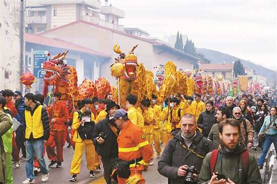 为庆祝中国农历蛇年春节,意大利普拉托市华人聚居区近日举办大型巡游活动,吸引数千民众观看。图为巡游活动上,人们跟随舞龙队伍观看、拍摄。