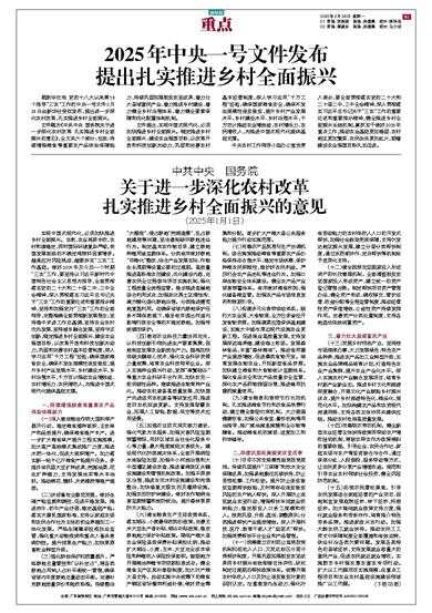 2025年中央一号文件发布 提出扎实推进乡村全面振兴