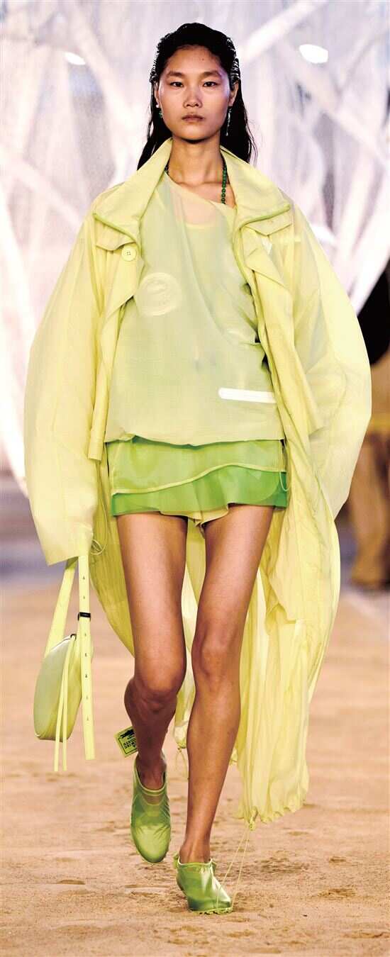 Off White 贴合身形的机能拉链外套配搭轻薄材质的裹身裙与高跟凉鞋,充分演示出“进可职场冲锋陷阵,退可人生旷野”的穿搭适配性宗旨。 |