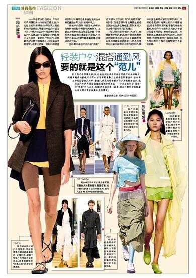 近几年户外风潮火热,随之也让相关单品不仅出现在户外活动场合,亦越来越多地被使用于街头与写字楼通勤人士的造型穿搭当中,各时尚品牌也纷纷加入户外“赛道”,或是将珍贵面料与户外性能相结合,或是让户外风再混搭碰撞风格迥异的单品——户外穿搭已非“功能”与“硬核”的代名词,机能单品跳出单一场景,通过大胆的穿搭配置全面关照日常多场景的造型需求。 ■新快报记者 梁彧/文(资料图片) 趋势解读 2025年春夏流行趋势中,户外运动风混搭的活力与舒适仍是主流,与过往主打防寒保暖、防雨防风从而面料相对偏硬挺、厚重的专业户外装备不同,今季无论各大时尚品牌还是专业户外品牌,都打破固有设计逻辑,推出令人耳目一新的轻户外系列,保持款式舒适简约的基础上,也让单品更好驾驭,适穿性更强。同时利用轻盈材质和对比醒目的色彩撞色呈现出有趣的叠影效果,为时装增添活力。 传统户外服饰与装备大多倾向色彩鲜艳搭配中性色和大地色系,主要为方便野外遇险时紧急求救,今季如水彩般柔和又清新的色彩加入到轻户外单品,为建立轻盈叠层概念提供更多可能。 宽松廓形是轻户外风的“灵魂”,这无疑与当下流行的“松弛感穿搭”相契合,但想穿搭时髦也需要注意造型装扮的全身松弛有度,否则易陷入仅方便行动却无“型”的窠臼。 设计简约的冲锋衣、大夹克、阔腿裤等户外风首选,如今更多聚焦轻透防晒的皮肤衣以及由工装裤改良而来的降落伞裤或裙装上:前者在夏季对抗紫外线和防水透气的同时,提供丰富色彩层次感及可调节设计,方便打造更多时尚属性的户外混搭造型;后者则因收紧时能营造气球般的量感,结合中长长度和反光嵌入等设计凸显实用风格,热度持续上升。亦有更多品牌尝试运用水袋背心、防水围裙、雨披等配件打造层搭效果,也为性别和尺寸等的包容性赋予了新的思路。 秀场灵感