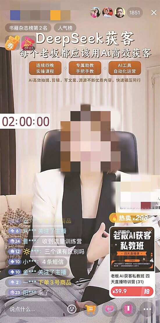 “DeepSeek保姆级教程”“如何靠DeepSeek快速赚钱”“用DeepSeek玩转电商运营”……近期,随着AI工具DeepSeek的热度攀升,与之相关的付费课程也在网络上爆发式增长,涵盖基础入门、进阶技巧乃至商业变现等多个领域。然而,在各种华丽包装和营销话术的背后,这些课程的质量参差不齐,不少商家利用信息差,将其变成了一种新的“流量收割”手段。因此专家提醒,消费者应理性选择AI课程,切勿盲目跟风学习,陷入商家制造的焦虑营销误区之中。 ■采写:新快报记者 梁贤安 高京 ■图片:网上截图 1 付费课程热销 9.99元教注册账号 1999元卖跨界玩法 新快报记者在某电商平台上搜索,与DeepSeek使用相关的课程大量涌现,售价从几元至上千元不等。这些课程内容五花八门,从如何使用DeepSeek的基础概念,到教授如何使用指令集、提示词更好地命令DeepSeek,再到如何用其做电商运营赚钱。 在一份售价9.99元的“DeepSeek使用技巧大全”课程,记者发现课程有大量内容是介绍AI公司和教软件下载、账号注册等操作,而所谓的“技巧大全”不过是官网上免费提供的提示词示例。另一份售价14.99元的“DeepSeek高效使用指南”课程,标题强调DeepSeek,但实际内容注水严重,还有大量与其他大模型有关的内容,更像是AI知识“大杂烩”。在该电商平台上,DeepSeek和其他应用跨界结合使用教程则更贵,例如“DeepSeek+直播玩法”售价高达499元,“DeepSeek+跨境电商网站”售价更是高达1999元。 自由职业者林女士觉得自己“被割韭菜”了。她告诉记者,自己花了29元购买了一门名为“DeepSeek自媒体起号指南”的课程,本以为能学到更实用的运营技巧,结果课程内容不仅基础,讲解还很笼统,几乎没有参考价值。“这些内容网上随便一搜就能找到,甚至直接问DeepSeek也能得到答案,花这笔钱实在不值。”林女士无奈地说。 除了上述课程,一些技术达人通过直播教学、社群运营等方式,将DeepSeek的使用技巧包装成“致富秘籍”,吸引了大量用户付费学习。记者在某知识付费App看到,占据畅销榜前列的是一个名为“DeepSeek副业俱乐部”的社群。记者支付50元加入该社群后发现,群主会定期发布主题课程,例如“用AI数字人制作口播短视频”“用DeepSeek一键生成PPT教程”等,此外还配套微信群和直播答疑。截至当天,该社群付费成员已突破7100人,这意味着社群发起人已收入35万余元。 2 卖课套路揭秘 放大焦虑、包装名师、推广变现 DeepSeek“卖课热”本质上是“AI焦虑”营销的又一次重演。早在ChatGPT、Sora等概念爆火时,市场就曾涌现大量AI付费课程,而如今的DeepSeek课程不过是“换汤不换药”,依旧沿袭着利用信息差和焦虑心理推动销售的套路。 “AI将彻底改变未来的商业模式,不学人工智能就会被淘汰!”深夜11点,在一个在线人数近2000人的直播间里,一名博主仍在卖力推销她的付费课程“DeepSeekAI获客私教班”,声称AI已成为各行各业老板的必修课,试图制造“危机感”来促使观众下单。 放大焦虑,已成为商家吸引学员的主要手段。“认知差才是最大红利”“某大厂裁员50%内容岗,AI替代率超预期”……在直播平台上,不少博主不遗余力地鼓吹,只要购买他们的DeepSeek课程,就能快速赚钱,实现财富自由。 为了吸引更多学员,这些课程甚至故意夸大AI技术对传统职业的冲击,利用大众对新技术的不熟悉而产生的担忧心理,诱导用户付费。然而,实际课程内容往往缺乏深度和实用性,甚至存在虚假宣传、夸大效果等问题。 近日,一份名为《DeepSeek:从入门到精通》的教程在网络上热销,价格从1元至20元不等,已有数不清的消费者下单。然而,经查证,这份教程实际上源自清华大学某教授的一次免费线上讲座PPT,原本可免费获取。但由于该教程内容翔实、质量较高,吸引了不少博主将其作为个人“独家干货”进行宣传和售卖。对此,该清华教授团队此前已在线辟谣,明确表示该报告从未授权任何第三方付费售卖,并提醒用户谨防信息差营销。然而,记者目前仍然在多个平台上见到该课程在售。 不仅是教程被包装售卖,一些DeepSeek社群也以“免费分享”为噱头,实则借助分销和推广实现盈利。以此前所述的“DeepSeek副业俱乐部”为例,群主除了发布关于DeepSeek赚钱的“福利”外,还包含引导用户推广社群获取分销收益、拉群返佣的内容。按照社群规则,用户每推广1人即可获得9.5元赏金。目前,该群已拉新上千人,赚取了过万元的推广费。 3 “AI加持”属性 带火周边市场,实际价值有待检验 DeepSeek的火爆不仅推动了知识付费热潮,还催生了一系列相关周边产品。在电商平台,不少商家推出印有DeepSeek标志的U盘、耳机、鼠标、智能眼镜等,宣传其具备“AI加持”属性。例如,一款售价在599至799元之间的鼠标和键盘套餐备受追捧,商家宣称其搭载6大通用模型和3大专业模型,能够用于AI问答、写作、PPT制作等。记者进入该品牌直播间,主播正在演示产品,并强调其“推理能力更强,性价比更高”,能够提升用户的工作效率。然而,这些产品的其他配置与普通鼠标键盘无异,仅借助DeepSeek的热度进行营销。 在社交平台上,DeepSeek凭借其独特的回答风格吸引了大量年轻用户,一些商家借此打造“AI运势大师”人设,并以此开展商业化运营。例如,有商家利用“AI算婚姻”“AI问事业”等噱头开设直播,用户通过赠送打赏即可获得DeepSeek的分析服务;也有商家在电商平台销售水晶