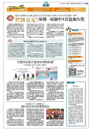 3000万元 3月1日至3月25日,湖北体彩开展“奖上有奖,欢乐加倍”即开型体育彩票营销活动。活动期间,凡在湖北省内任意体彩门店购买活动票种(50元面值:“大满贯”;30元面值:“火凤凰”