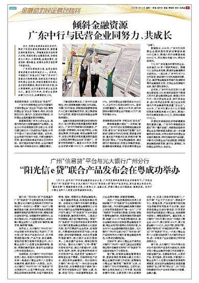 3月6日,在中共广州市委金融委员会办公室、广州市发展和改革委员会共同指导下,广州成功举办广州“信易贷”平台与光大银行广州分行“阳光信e贷”联合产品发布会,深化政银企务实合作,“量身定制”小微融资