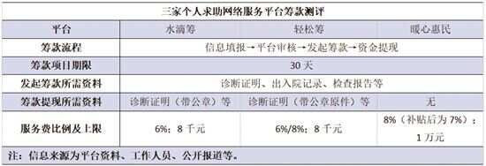 水滴筹为6%,轻松筹、暖心惠民最高至8% 近来,关于个人求助网络服务平台(下称“筹款平台”)上调服务费的消息引发关注。去年末,民政部指定水滴筹、轻松筹、暖心惠民为个人求助网络服务平台,意味着行业进入了更加规范和健康的发展阶段。在选择平台的过程中,最受关注的除了审查过程,便是服务费收取问题。新快报记者实测发现,暖心惠民目前服务费为8%;轻松筹调整为8%和6%两种收费模式;水滴筹为6%,目前行业最低。 ■新快报记者 林广豪 筹款流程大致相同 近日,新快报记者以筹款发起人的身份对三家筹款平台进行了实测。三家平台的筹款流程大致相同,基本为个人填报信息,平台进行审核,随后发起筹款、资金提现。 记者看到,发起筹款一般需要填写患者的身份、疾病、个人及家庭资产的相关信息。水滴筹的官方介绍显示,筹款人需要提供2种以上的证明材料,其中诊断证明是必要的,还有出入院记录或检查报告等;轻松筹要求提供带有患者病情的医疗单据,项目验证需要至少四种两年内清晰完整关于病情介绍的医疗单据原件。在接受记者咨询时,水滴筹的筹款顾问称:“医疗材料可以是诊断证明、CT检查报告单等,需要包含患者姓名和疾病名称的单子。”轻松筹的工作人员表示:“检查报告、诊断证明、缴费记录……任意一种就可以发起筹款。”暖心惠民的工作人员则表示,发起筹款需要提交诊断证明、检查报告等。 对于患者经济状况的查验,三家平台的工作人员均表示,筹款人需要如实填写患者及家庭的资产情况,例如家中是否有房产以及房产估值。水滴筹的工作人员表示,平台在筹款页面提供了显著的举报、证实、评论功能,供患者社交网络中的熟人参与验证,从而能进行及时有效的纠错。轻松筹的工作人员表示:“假如你的家庭(经济)条件还可以,但你在筹款时说家庭条件不太好,你发起之后身边会有人举报的,平台核实后款项无法进行提现。” 据悉,去年9月开始施行的《个人求助网络服务平台管理办法》(下称《管理办法》)明确规定,个人求助网络服务平台应当要求求助人、信息发布人提交求助信息和相关材料,涵盖求助人因疾病等原因导致家庭经济困难的情况等,平台应当对求助信息的真实性进行查验。 服务费比例最高为8% 在筹款期限方面,目前三个平台的筹款项目期限均为30天,均支持一边筹款一边提现,项目提现时需要提交诊断证明书(带公章)等。 而提现时被扣取的费用最受关注,包括平台的服务费和第三方支付平台的支付通道费用,后者的比例均为0.6%,服务费目前已现较大差异。 新快报记者查看各平台服务协议发现,水滴筹按照单个筹款项目提现金额的6%收取服务费,上限为8000元。轻松筹依据协助服务方式不同,服务费收取比例分别为8%和6%。其中线下人员指导发起的为8%,线上人员协助发起的为6%,两种方式上限均为8000元。暖心惠民的服务费收取比例最高为8%,上限也最高,为1万元,目前补贴后可减至7%。 值得一提的是,今年2月曾有媒体报道称,轻松筹的服务费仍为6%,上限为8000元。新快报记者就服务费上调一事咨询轻松筹客服,但并未获得相应回复。有资深业内人士指出,筹款平台可以根据合理的成本来推定管理费,但要提前公示,并向公众做出说明,包括收费的逻辑、收费比例的制定依据等。
