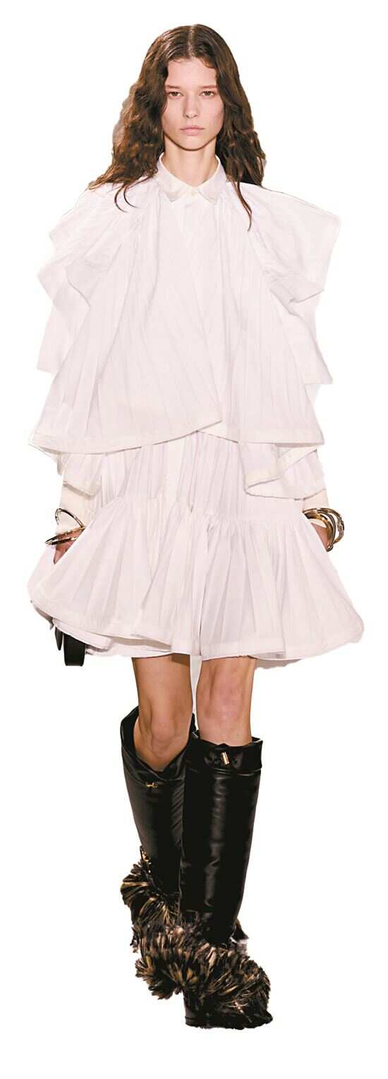 通过立体剪裁如翅膀般包裹身形的垂褶衬衫,让整体的造型穿搭营造出极具雕塑感的氛围。 |