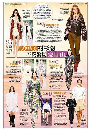 本季,衬衫彻底挣脱了“通勤单品”的“刻板”标签,设计师们以“极繁主义”为核心理念,通过丰富细节、夸张廓形和多样性材质赋予了这一经典单品前所未有的戏剧张力与艺术表达。从波希米亚的浪漫不羁到华丽装饰衬衫的繁复张扬,每件衬衫都成为彰显个性的宣言,掀起“安静奢华”之后的“极繁主义”浪潮。 ■新快报记者 梁彧/文 (资料图片) Focus A 波希米亚衬衫 自由与性感交响 2025春夏重塑经典衬衫的主要改良方法是加大廓形——相比传统紧身或合身的衬衫更注重宽松感,不仅体现在衣身,也延伸到袖口与领口等细节处,让衬衫的整体轮廓看起来更宽大、随意。 这一点在本季波希米亚风衬衫上尤其展现得淋漓尽致,结合波希米亚式宽松廓形,打破传统衬衫的束缚感,让穿着者更能自由展现个性且波希米亚风格在这一季亦迎来更性感与更富有层次感的进化,设计师通过宽大的袖子、精致的蕾丝和薄透的面料打造出充满浪漫气息的衬衫款式。 Focus B 垂褶衬衫 流动的诗意美学 设计师通过轻盈面料和复杂褶皱设计,赋予衬衫一种飘逸的质感,标志性的垂褶设计更成为本季优雅的代名词。 Focus C 华丽装饰衬衫 极繁主义狂欢 “极繁主义”席卷T台,衬衫成为设计师炫技的舞台,各种复杂装饰和迷人图案都被装点在这一经典单品上,展现强烈的视觉冲击力,适合晚宴或派对场合。 遵循“一繁一简”的搭配法则,让衬衫成为造型焦点,而其余单品则保持克制,避免整体造型过于繁复。 Focus D 优雅领子衬衫 领间精致复古 领子已成近年设计重点,今季衬衫领子更偏向精致复古气质,如以文艺复兴时期的拉夫领、彰显华丽优雅的羽毛领、“不走寻常路”的侧开领等,搭配高腰裤或铅笔裙,即可打造出经典与颠覆并存的职场时髦新造型。