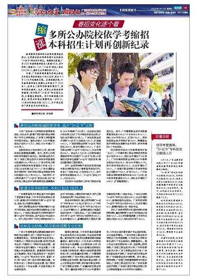 春季高考是高考综合改革的重要组成部分,主要面向参加学考的高中生和参加“3+证书”考试的中职生。根据相关数据,广东2025年春季高考报名人数超64万,其中学考人数超44.2万,“3+证书”考试人数达200186人,整体比去年增加约4万人。 目前,广东春季高考最低录取分数线及各招生院校的招生计划已出炉,考生于3月13日开始填报志愿。记者梳理发现,今年春季高考招生规模比去年减少了2000多人,在考生人数再创新高的情况下,竞争将更加激烈。此外,多所公办院校依学考缩招,同时提升“3+证书”考试招生比例,以调整生源结构。而今年春招最大的亮点,则是本科招生规模的进一步扩大,12所本科院校共招1825人,为中职生提供了更多直升本科的机会。 ■新快报记者 徐绍娜 多所公办院校减招依学考,提升“3+证书”比例 今年广东共有103所院校在春季高考招生,对比去年,新增了深圳城市职业学院和广州华立学院招生,广东理工学院暂停专科层次招生。据初步统计,2025年整体招生计划约27.4万人,相比2024年减少了2000多人。 各院校招生计划此前已公布,部分院校招生规模继续调整。其中,多所公办院校依学考缩招引发关注。深圳职业技术大学、广东轻工职业技术大学依学考普通类分别减招523人和515人;广东水利电力职业技术学院依学考普通类今年有1823个计划,比去年减少近700个;广东交通职业技术学院和广东科学技术职业学院依学考分别减招1400人和1800人。与此同时,不少院校提升了“3+证书”招生比例,如广东水利电力职业技术学院春季招生规模整体比2024年缩减了300多人,但在招生类别计划安排上加大了对中职生的招生比例,计划比去年增加300多人。广东机电职业技术学院“3+证书”计划招生1981人,扩招超1000人。广东财贸职业学院“3+证书”考试招生2350人,较去年增加1138人。广东文艺职业学院“3+证书”计划968人,比去年增加688人。有业内人士认为:公办院校通过调减依学考计划提升“3+证书”比例,从而增加优质学位提振“3+证书”的报到率,响应创新强校工程的要求。 另外,由技师学院升格而成的深圳城市职业学院首次加入春季高考招生行列,共有5个招生专业,计划招生470人,其中依学考成绩招生95人,“3+证书”招生375人,占比达80%。 正加快升本进程的三所热门院校亦备受关注。其中,广州番禺职业技术学院春季高考共招1990人(不含退役士兵10人),相比2024年的234人,扩招1756人。深圳信息职业技术学院扩招144人,顺德职业技术学院招生规模与去年持平,依学考增加6个专业招生。 民办院校则成为今年春季高考扩招“主力”。广州南洋理工职业学院依学考招生计划为3600人,相比去年增加了300多人。广州华南商贸职业学院2025年春季总招生计划6200人,较2024年增长12.7%,其中依学考拟招3700人,比去年增加了500人。广东南方职业学院今年依学考招生计划数为7763人,扩招763人。广州东华职业学院春季高考共有4550个计划,其中依学考普通类3210人,相比去年增加了1880人,扩招幅度颇大。 新增3所本科招生,本科计划达1825人 广东春季高考为中职生直升本科提供了更宽敞的渠道,今年本科招生院校达到12所,新增3所本科院校开展“3+证书”招生,招生总计划数再创新高。 其中,深圳职业技术大学首次增加“3+证书”本科招生,招生专业为数字动画专业,计划招30人。广东轻工职业技术大学同样首次开展“3+证书”本科招生,在产品设计专业招35人。另外,民办本科广州华立学院首次在“3+证书”本科招生,计算机科学与技术、电气工程及其自动化两个专业共招生100人。 其他本科院校中,韩山师范学院“3+证书”本科有300个计划,扩招100人;广州科技职业技术大学“3+证书”本科总计划300人,比去年增加50人,新增机械设计制造及自动化技术一个招生专业。广东工商职业技术大学“3+证书”本科总计划同样为300人,比去年增加50人,新增物联网工程技术、数字媒体技术等2个招生专业。广东白云学院“3+证书”本科总计划为300人,比去年增加50人,新增动画专业招生。广东科技学院“3+证书”本科总计划为300人,比去年增加50人,新增环境设计这一招生专业。 另外,广东技术师范大学、韶关学院、岭南师范学院、嘉应学院等“3+证书”本科招生计划共有160人。从公布的数据来看,今年本科总招生计划达1825人,相比去年扩招了465人。 优化专业结构,56所院校调整专业分组 广东今年春季高考志愿填报继续实行院校专业组模式,即1个院校专业组为1个志愿填报单位。报考普通类专业的考生,可填报20个院校专业组志愿;报考艺体类专业的,可填报10个院校专业组志愿。每个院校专业组可填报6个专业志愿、1个是否服从专业调剂选项。普通类和艺体类专业不能兼报,考生只能选择其中一类进行填报。“3+证书”考试则分本科、高职(专科)两个批次,两个批次同时填报志愿。本科批次设1个院校专业组志愿,每个院校专业组设1个专业志愿,不设是否服从专业调剂选项。 值得注意的是,今年多所高校因新增专业招生和优化专业结构,专业组有所调整。新快报《阳光高考》志愿填报顾问杨锐鑫表示,据初步统计,今年共有56所院校存在专业分组调整,公办院校有38所,民办院校有18所。专业分组增加的院校比分组减少的院校多,增加分组较明显的院校有9所,分别是肇庆医学院、广州番禺职业技术学院、广东水利电力职业技术学院、河源职