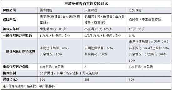 新快报讯 记者林广豪报道 近年来,免健康告知(下称“健告”)的百万医疗险愈发常见。记者对比发现,此类产品投保宽松,且保障一般既往症,但与普通百万医疗险相比,部分产品按照社保内、外设置免赔额。健告是指投保人向保险公司如实告知被保险人的健康情况,保险公司据此进行风险评估,给出核保结论,直接影响到消费者能否成功投保。记者注意到,去年以来,多家保险公司推出免健康告知的百万医疗险,且保障一般既往症。 免赔额社保内、外有区别 结合上线时间、市场热度等因素,新快报记者选择国寿财险的“惠享保(免健告)百万医疗(尊享版)”(下称“惠享保”)、人保财险的“长相安3号(免健告)百万医疗险(尊享版)”(下称“长相安”)、众安保险的“众民保·中高端医疗险”(下称“众民保”)进行测评。三款产品均免健告,保障时间均为1年,属于不保证续保的短期医疗险。 以30岁男性为自己投保为例,“惠享保”“长相安”和“众民保”的保费分别为364元、388元和609元,其中“长相安”选择1万元免赔额。 在一般住院医疗的保障方面,三款产品均覆盖社保内、外的医疗费用,等待期均为30天。其中,“众民保”的保额为300万元,免赔额较优为0元,但报销规则较复杂,若未用社保结算,2万元(含)以下赔付30%,以上赔付60%。另两款产品的保额更高,社保内、外的保额各有300万元,在未用社保结算的情况下,赔付比例为60%,反之赔付比例为100%。社保内、外“惠享保”均有1万元的免赔额,“长相安”可选1万-3万元的免赔额。 此外,“惠享保”和“众民保”提供重大疾病医疗保障,保额分别为600万元和300万元,均为0免赔,“长相安”未专门设置该项保险责任,但有重疾住院津贴等。 还须看清免责疾病范围 此次测评的三款产品均保障一般既往症,但明确免责范围为肿瘤类、肝肾疾病类等五类疾病。相比之下,“惠享保”的免责范围较大,不保障肾功能不全、先天性心脏病、支气管扩张等既往症。 有保险代理人向记者表示,与传统百万医疗险相比,投保宽松、保障范围较广的百万医疗险更适合身体欠佳的消费者。投保前,消费者应结合身体情况和产品的免责条款选择保障更全的产品,若预算充足,可投保搭配更丰富就医资源的产品。在身体条件允许的情况下,消费者还应优先考虑投保保证续保的医疗险。