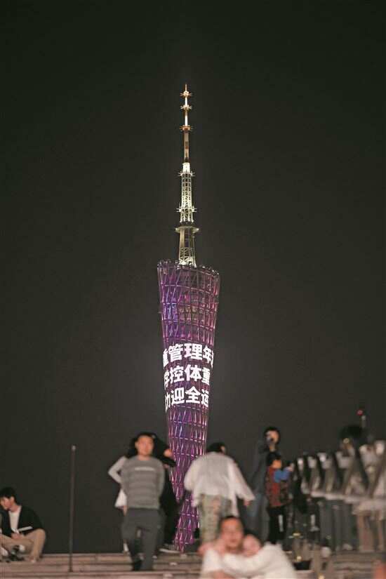 ■3月22日晚,广州塔亮灯,发出广东体重管理年倡议,呼吁“科学控体重 活力迎全运”。