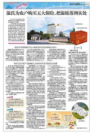 近日,多个平台宣布为外卖小哥缴纳社保,该举措获得社会肯定,相关话题也冲上热搜。 记者注意到,除了穿梭在风里雨里的外卖小哥将获得更好的保障外,温氏股份的4.5万户养殖户也将获得温氏购置的五大保险。这是温氏股份首次面向全体合作农户特别推出“爱农守护”计划,创新性地为合作农户定制人身保险和栏舍保险两大类保险产品,涵盖医疗保险、养老保险、意外险、补充医疗险、栏舍财产保险等五个险种,进一步巩固提升“公司+农户”合作模式,为合作农户提供更加全面的风险保障。 2024年营收突破千亿元,继2019年后利润再次近百亿元 根据温氏股份业绩快报公告,2024年,温氏预计实现营业收入1049亿元,成功跻身千亿营收农牧企业行列;营业利润近100亿元,实现扭亏为盈,其中养猪业务盈利82亿-84亿元。 除了出栏量的增加,成本的降低也是温氏2024年利润增长的关键因素。2024年全年温氏肉猪养殖综合成本降至7.2元/斤,较2023年同比下降约1.2元/斤。另据温氏股份最新投资者关系活动记录显示,2025年1月,公司肉猪养殖综合成本为6.4-6.5元/斤,2月份,综合成本进一步降至6.3元/斤左右,稳居行业第一梯队。温氏表示,在上年底饲料原料价格不变的前提下,初步制定2025年全年平均肉猪养殖综合成本目标不超过6.5元/斤。 值得注意的是,这是温氏股份自上市以来首次营收突破千亿大关,也是继2019年后,利润再次实现近百亿元级别。 这也标志着温氏股份成为继新希望、牧原、海大之后,我国又一家营收超千亿的上市猪企。温氏股份同时也是目前国内为数不多拥有千亿市值的上市农牧企业之一。 坚持“公司+农户”发展模式,为全体合作农户购买五大保险 据了解,温氏的养殖结构采用紧密型“公司+农户”模式,这是其获得持续增长和壮大的主要驱动力之一。温氏基本上均采用“公司+农户(或家庭农场)”模式,并在新的时代背景下不断迭代升级,如“公司+现代养殖小区+农户”“政银企村(户)”多方共建等模式。 据温氏2024年半年报数据显示,公司的合作农户数量为4.58万户。各区域合作农户占总户数的比例分别为:华南区域41.58%,华东区域20.11%,华中区域16.26%,西南区域16.78%,华北区域3.40%,西北区域1.09%,东北区域0.78%。 因此,在迈向更高更远的路上的同时,温氏紧密携手养殖户们,启动“爱农守护”计划,购置五大保险,为每一个与温氏并肩作战的农户朋友提供坚实保障。 那么,保险对农户有哪些重大的意义呢?先来看两个案例: 正面案例 买了保险,成功挽损90% 2021年7月,建水温氏合作家庭农场张某的猪舍因暴雨导致地基、房屋受损,损失约21万元,由于买了财产险,成功理赔18.9万元,挽回了大部分损失。 负面案例 没买保险,自担损失100% 2024年9月,广西养禽公司合作养鸡户梁某,鸡舍发生火灾,造成鸡和鸡舍主体、设备合计损失约8万元。由于没有购买栏舍财产险,农户承担了全部损失。 不可否认,在农业保险的实际运行中,一个个真实的案例见证了它的保障力量。 近年来,我国农业保险的发展势头十分强劲,用一组数据便能直观地感受到它的飞速发展。 先看保费规模,2024年,我国农业保险保费收入突破1500亿元,这个数字相当惊人。回想过去,在2007年,我国农业保险保费规模仅为51.8亿元,而到了2022年,这一数字已经增长到1192亿元。短短十几年间,实现了数十倍的增长,足见农业保险发展的迅猛态势。 其中,参保户数也在不断攀升。2024年,农业保险惠及农户1.5亿户次,越来越多的农民朋友意识到农业保险的重要性,纷纷选择为自己的农业生产增添一份保障。 据悉,为有序推进农户保险业务工作,温氏股份采取分区域、分险种、分批次的策略逐步推广实施,在广东、广西、海南区域率先开展农户保险业务首批试点工作,试点险种为医疗保险、养老保险、意外险三个险种。目前,各试点单位积极响应,多部门高效协同合作,共同推进农户保险业务的开展。 前段时间,保险公司已成功为温氏股份14家试点单位的农户开具了统保的意外险保单,53家试点单位也分批对合作农户自行投保的保费进行补贴,共为1594名合作农户提供了免费的保险保障,标志着温氏股份“爱农守护”计划正式落地实施。 进入3月份,“爱农守护”计划已在温氏股份全面铺开,这也意味着温氏股份全体合作农户都可享受。 事实上,在温氏的发展进程中,合作农户始终占据着举足轻重的地位。温氏股份董事长温志芬在2025年新年献词中提到:公司与超过4.58万户农户合作,2024年合作农户获得总收益再创新高,真正实现了互利共赢。 因此,在大步迈向更高更远征程的同时,温氏始终将农户的利益与福祉放在重中之重的位置。近期,温氏特别面向全体合作农户推出“爱农守护”计划,全方位为养鸡户、养猪户、养鸭户等提供坚实保障,涵盖五大类保险: 一、个人补充医疗险:保额高达700万元,为人生健康保驾护航。 二、团体意外险:最高保额20万元,增强伙伴归属感和忠诚度。 三、栏舍财产险:最高按保险价值赔付,抵御风险稳固养殖基业。 四、城乡居民医疗险:与国家标准同步,让现在和未来都更有保障,让未来幸福生活可期。 五、城乡居民养老险:同步国标。 温氏股份“爱农守护”计划,不仅是温氏“精诚合作,齐创美满生活”企业文化核心理念的生动体现,更是温氏股份积极响应国家倡议,为带领合作农户实现共同富裕奠定坚实基础的一大创新。 这