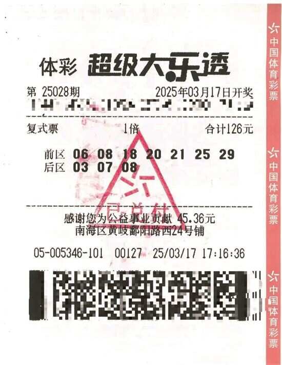 新快报讯 记者陆妍思 通讯员佛山体彩报道 继1月“开门红”中出2注大奖,佛山今年第3注超级大乐透一等奖又来了。超级大乐透第25028期开奖中,佛山南海区黄岐鄱阳路西24号铺4405005346体彩实体店购彩者通过一张“7+3”复式票,中出一等奖1注890万元,二等奖2注及小奖一连串,单票收获奖金919万元,贡献税收183.9万元。 中奖者刘先生(化名)通过手机扫码验奖得知自己中奖,次日下午就前往佛山体彩兑奖大厅兑奖。刘先生购彩多年,这次选的“03、07”两个尾号,是看到自己去年购买的一张大乐透的尾号随手加上去的,意料之外就击中了大奖。 对于这次中奖,刘先生表现得很淡定。他说这几年生活事业起起伏伏,由一家公司的企业老板变成打工族,心态从刚开始的迷茫,到后来慢慢调整,一切重新开始,积极生活。刘先生表示购买体彩也给自己带来积极的影响,“我不沉迷,购彩一方面是为了娱乐,给自己心理积极的调整,另一方面也为社会公益事业尽点绵薄之力。” 经历过风浪,对于这次中奖,刘先生说虽然开心,但更多的是理性。“中奖缓解了我的生活压力,但其实生活还是一样过。”刘先生表示未来将继续支持体育彩票和超级大乐透游戏,把购彩当作一种娱乐活动,不会将其视为赚钱途径,避免过度投入资金,为公益事业尽自己的一份力量。