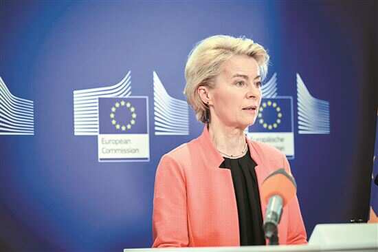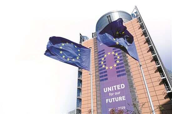 ■4月2日在比利时布鲁塞尔欧盟总部外拍摄的欧盟旗帜。 本版图片/新华社 |