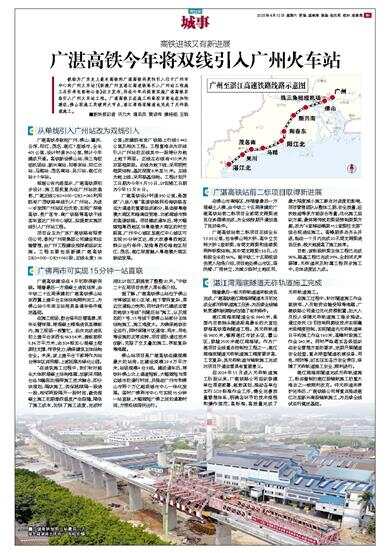 高铁进城又有新进展 被称为广东史上最长高铁的广湛高铁将更快引入位于广州市中心的广州火车站!《新建广州至湛江高速铁路引入广州站工程施工总价承包招标公告》近日发布,将在今年内提前实施广湛高铁双线引入广州火车站工程。广湛高铁正在施工的路段目前也在加快建设,佛山段施工突破两大节点,湛江湾海底隧道也完成了无砟轨道施工。 ■新快报记者 许力夫 通讯员 黄诗伟 康桂铭 王锐 从单线引入广州站改为双线引入 广湛高铁串联起广州、佛山、肇庆、云浮、阳江、茂名、湛江7座城市,全长401公里,设计时速350公里,预计今年建成开通。高铁新设佛山站、珠三角枢纽机场站、新兴南站、阳春东站、阳江北站、马踏站、茂名南站、吴川站、湛江北站9个车站。 根据公告内容显示,广湛高铁原初步设计、施工图批复为在广州站改造前,广湛正线DK0+000-DK1+060利用既有广茂铁路单线引入广州站。为进一步发挥广州站区位优势,实现广深港高铁、贵广客专、南广铁路等高铁干线客车直达广州中心城区,拟提前实施双线引入广州站工程。 项目业主为广东广湛铁路有限责任公司,委托广州局集团公司建设和运输管理,由广州工程建设指挥部组织实施。工程主要包括新建广湛高铁DK0+000-DK1+060段,正线长度1.06公里;改建既有京广铁路上行线0.442公里及相关工程。工程重难点为双线引入广州站的正线其中一段将分为地上地下两层。正线左右线有410米为双层框架段。右线为地下线,采用明挖框架结构,基坑深度6米至11米。左线为地上线,采用路基结构。工程计划开工日期为今年5月10日,计划竣工日期为今年12月31日。 广湛高铁设计时速350公里,是国家“八纵八横”高速铁路网沿海铁路客运大通道的重要组成部分,是连接粤港澳大湾区和海南自贸港、北部湾城市群的高速铁路。项目建成通车后,将大幅缩短粤西地区与粤港澳大湾区的时空距离,广州中心城区至湛江中心城区可实现90分钟互达,极大改善粤西地区群众出行条件,助推粤西沿海地区阳江、茂名、湛江深度融入粤港澳大湾区联动发展。 广佛两市可实现15分钟一站直联 广湛高铁建设在4月初取得新突破。随着最后一方混凝土浇筑结束,由中铁二十五局承建的广湛高铁佛山站东西翼上盖平台主体结构顺利完工,为佛山站今年底主站房具备通车条件奠定基础。 在施工现场,数台塔吊巨臂高悬,泵车长臂伸展,将混凝土精准浇筑至模板内,施工现场一派繁忙。此次完成浇筑的上盖平台东西长563.54米,盖板面积5.36万平方米,由324根实心混凝土框架柱支撑、传导受力,确保建筑主体结构安全。未来,该上盖平台下部将作为站台停车区间雨棚,上部拓展为绿化公园。 “在浇筑施工过程中,我们针对超长大体积混凝土结构难题,创新采用跳仓法与膨胀加强带施工技术融合,即分块规划、隔块施工,类似跳棋隔一段浇一段,相邻两段隔开一段时间,避免混凝土施工初期激烈温差产生裂缝,降低了施工成本,加快了施工进度,完成时间比计划工期提前了整整20天。”中铁二十五局项目负责人周长磊介绍。 据了解,广湛高铁佛山站位于佛山市禅城区核心区域,地下管网复杂,周边交通能力饱和,同时进行已建成运营的地铁3号线“先隧后站”施工,以及规划的7号、15号线下穿佛山站部分主体结构施工,施工难度大。为确保地铁安全运行,同时保障片区通信、用水、用电等设施的正常运转,项目团队通过技术创新,克服了交叉叠加施工、界面复杂等难题。 佛山站项目是广湛高铁在建规模最大的站房,总建设规模29.4万平方米,站场规模4台9线。建成通车后,将弥补佛山北上通道短板,大幅缩短与周边城市的通行时间,并推动广州市和佛山市两个万亿超级城市中心一体化发展。届时广佛两市中心可实现15分钟一站直联,大幅缩短广佛之间的通勤时间,方便沿线居民出行。 广湛高铁站前二标项目取得新进展 在佛山市南海区,伴随着最后一方混凝土入模,由中铁二十五局承建的广湛高铁站前二标项目全部简支箱梁浇筑任务圆满完成,为全线按期开通创造了良好条件。 广湛高铁站前二标项目正线全长10.38公里,包含佛山特大桥、高中立交特大桥2座桥梁,含简支箱梁和连续梁两种桥梁结构,其中简支箱梁183孔,占标段全长的56%。据中铁二十五局现场负责人陆浩介绍,项目地处佛山市区,居民楼、厂房林立,为减少临时土地征用,最大限度减小施工断点对进度的影响,项目管理团队从整体工期、安全质量、经济效益等多方面综合考量,优化施工组织方案,最终将传统的梁场预制架梁方案,改为“6套移动模架+12套梁柱支架”组合现浇法施工。高峰期多点齐头并进,能在一个月内完成20孔简支箱梁浇筑任务,极大地提高了施工效率。 目前,该标段桥梁主体工程已完成96%,路基工程已完成95%,全封闭式声屏障、无砟道床及附属工程同步施工中,总体进度近九成。 湛江湾海底隧道无砟轨道施工完成 随着最后一板无砟轨道道床板浇筑完成,广湛高铁湛江湾海底隧道本月初完成全部无砟轨道施工任务,为后续全线铺轨贯通和联调联试创造了有利条件。 湛江湾海底隧道全长9640米,是国内目前独头掘进距离最长的大直径穿海高铁盾构隧道工程。其无砟轨道长9600米,横跨湛江市坡头区、霞山区,穿越2500米湛江湾海域。作为广湛项目全线重点控制性工程之一,湛江湾海底隧道无砟轨道施工精
