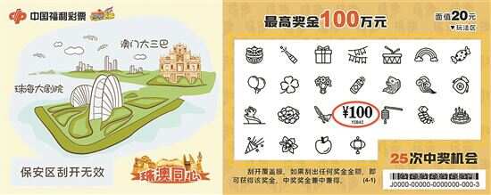 新快报讯 记者陆妍思 通讯员粤福彩报道 为了回馈广大彩民对中国福利彩票事业的关心与支持,广东省福利彩票发行中心于3月20日起在全省范围内(不含深圳市)开展“珠澳同心”刮刮乐即开票1200万元赠票营销活动。近日记者从广东省福彩中心获悉,活动开展以来,已有超13800位幸运儿喜提“双响礼包”,在收获中奖喜悦的同时赢取额外赠票,好礼不断惊喜连连。 “珠澳同心”主题即开票面值20元,共25次中奖机会,最高奖100万元,全套张数4张。刮开覆盖膜,如果刮出任何奖金金额,即可获得该奖金。中奖奖金兼中兼得。“珠澳同心”为四联游戏彩票,这款游戏设计不仅赞许了自澳门地区回归25年来,两地人民共同创建繁荣之景,也表达了未来继续同心而行共创盛世的信心。 活动期间,凡购买“珠澳同心”即开票且单张彩票中得500元的中奖者,除兑付中奖奖金外,还可额外获赠一本价值500元的刮刮乐即开票,欢迎广大彩民朋友参与。 截至4月10日,赠票已送出18983本,赠票金额累计超过948万元,销售“珠澳同心”即开票筹集公益金累计超过3760万元。 值得一提的是,彩民购买的每张福利彩票,都是为社会福利和公益事业贡献力量。福彩刮刮乐公益金提取比例是20%,也就是说,一张10元的福彩刮刮乐,就有2元拨入福彩公益金。筹集到的公益金,除被广泛用于“扶老、助残、救孤、济困”等公益领域,还用于补充社保基金,惠及普罗大众。