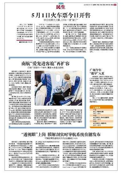 已推广至国内9个城市、覆盖46条直达航线 新快报讯 记者李佳文 通讯员南宣报道 为满足携宠出行旅客的出行需求,中国南方航空于4月15日起,在广州至上海虹桥往返航线的基础上,将“爱宠进客舱”