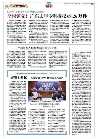 新快报讯 记者黄闻禹报道 4月24日,广州市政府新闻办举行知识产权工作专题新闻发布会,通报去年以来广州知识产权发展与保护状况。广州市市场监督管理局副局长万众表示,2024年,广州知识产权工作硕果