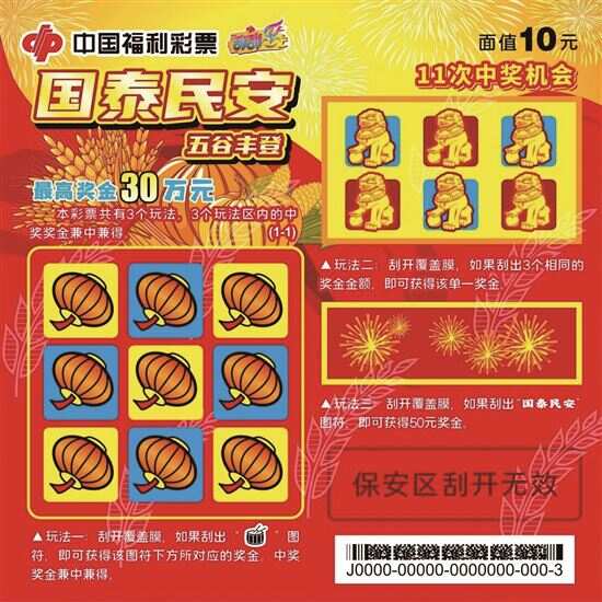 新快报讯 记者陆妍思 通讯员粤福彩报道 国泰民安添福瑞,五谷丰登送吉祥。近日,刮刮乐即开票“国泰民安—五谷丰登”新票登场,各位购彩者可以到各大销售点尝鲜,为公益出一份力。 刮刮乐“国泰民安”以红色为主色调,设计突出喜庆感,票面上巍峨的华表、金黄的稻谷、大红的灯笼、缤纷的礼花……均呈现出一派国泰民安、巍巍大国的风采。 该票种面值10元,最高奖金30万元,返奖率65%。共有3个玩法,3个玩法区内的中奖奖金兼中兼得。玩法一:刮开覆盖膜,如果刮出“鼓”图符,即可获得该图符下方所对应的奖金。中奖奖金兼中兼得。玩法二:刮开覆盖膜,如果刮出3个相同的奖金金额,即可获得该单一奖金。玩法三:刮开覆盖膜,如果刮出“国泰民安”图符,即可获得50元奖金。 刮刮乐凭着玩法简单、即刮即中、返奖率高等优势,成为年轻人的新选择。随手一刮,梦想未必成真,但您购买每张福利彩票都是为社会福利和公益事业贡献力量。福彩刮刮乐公益金提取比例是20%,也就是说,买一张10元的福彩刮刮乐,就有2元拨入福彩公益金。筹集到的公益金,被广泛用于“扶老、助残、救孤、济困”等公益领域。