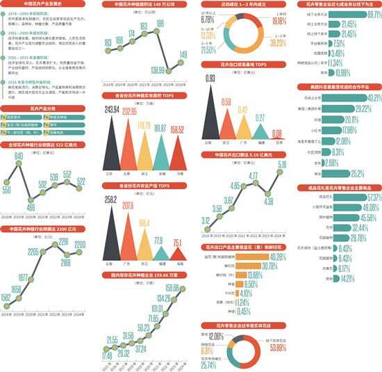 2 国内159.66万家花卉种植企业 创造5.16亿美元出口额 中国既是花卉生产大国,也是花卉消费大国。近年来,随着与国际市场的交融越来越深,与国际市场在品种、价格、花期等方面的匹配度不断提高,中国逐渐成为全球花卉产业链的重要参与者。 企查查显示,近十年相关企业存量规模持续增长,自2015年末的十几万家一路攀升至2024年末的100多万家。数据显示,国内现存花卉种植相关企业达159.66万家。 从注册量来看,2024年全年注册相关企业31.13万家。截至目前,今年已注册花卉种植相关企业7.61万家,其中前2月注册4.56万家,同比增长11.18%。 从成立年限来看,近四成花卉种植相关企业的成立年限在1-3年,占比39.23%。其次,成立年限在3-5年的相关企业占比21.50%。成立年限在10年以上的相关企业占比6.76%。 作为世界重要的花卉消费和出口贸易国,据海关统计,2024年我国花卉出口额近5.16亿美元。出口产品中超四成是盆花(景)和庭院植物,其次是鲜切花和鲜切枝(叶)。 在进口的7个类别中,种球、鲜切花、盆花(景)和庭院植物三大类别占总进口额的90.02%。除盆花(景)和庭院植物、鲜切枝(叶)和干切花3个类别进口额下降外,其他4个类别进口额均呈增长态势。 3 广东是花卉生产和出口大省 以兰花和盆景植物为主 随着生产布局的不断优化,中国花卉行业区域特色日益突出,目前已形成以云南、四川、江苏、浙江、海南为重点的南方热带、亚热带花卉产区;以广东、福建为重点的南方热带观叶植物产区;以浙江、四川、河南、河北为重点的观赏苗木产区;以北京、山东、河北为主的北方花卉产区;以辽宁为中心的东北花卉产区。 全国已形成几个较稳定的生产区域。云南的鲜切花,广东、福建的观叶植物,江苏、浙江的盆景和苗木,上海的种苗及辽宁的种球等,基本上都已形成专业化、规模化生产,并开始走向集约化经营,涌现出如宜兴杜鹃、漳州水仙、庆成兰花等全国知名品牌,产品销往全国各地并出口到国外。 中国花卉年末实有面积排名前三的省域依次是江苏、云南以及浙江;按产值排名则依次是云南、广东和浙江。 按出口金额排名,前三的省份依次为云南、浙江、广东。其中,云南花卉出口量及出口金额在全国花卉出口量及出口金额中所占的比重分别为34%、34.23%,出口产品以各类鲜切花为主,主要销往泰国、日本、新加坡等东南亚国家。 浙江花卉出口量及出口金额在全国所占的比重分别为20.46%、21.49%,90%以上的花卉产品出口销往日本,以鲜切花产品为主。广东花卉出口量及出口金额所占的比重分别为27.08%、15.49%,主要出口销往中国香港、韩国、越南等东南亚国家/地区,出口产品以兰花为主,部分出口销往美国、荷兰、法国等欧美发达国家,出口产品主要为各类盆景植物。 4 “外卖鲜花”约占交易额1/3 三四线城市中老年人成新增长点 从产业布局来看,在上游领域,花材供应代表企业有锦苑花卉、英茂集团、森禾种业、东方园林、棕榈园林、岭南股份、蒙草生态、铁汉生态等。在产业链中游,中端花艺产品制作企业有花加、花点时间、爱尚鲜花等,高端花艺产品生产零售商包括野兽派、roseonly等,花卉电商零售平台包括花礼网、花巴士、淘宝、京东等。 在参与线上平台销售的花卉零售企业中,美团系占比最多,达到29.22%,其次是抖音和小红书,占20.11%和17.96%。显然“外卖鲜花”颇有市场竞争力,社交媒体平台也成为花卉零售业线上渠道运营不容忽视的一部分。淘宝、京东、美团、抖音等平台百花齐放,特别是“直播带货”“一件直发”模式发展迅猛。业内人士估算,各大平台贡献的花卉交易额可占行业总交易额的1/3左右。 抖音电商的数据显示,鲜花消费高峰不再集中在某个时间段,反映出消费者对于鲜花绿植的日常需求与欣赏价值的不断提升。 带货渠道方面,商家自营直播成为主导方式。消费群体方面,女性仍然是消费主力,占比61.4%。超六成鲜花消费者月收入在5001-15000元区间,超六成集中在二线城市及以上,超五成年龄在27-39岁。 同时也可以看到,男性消费者占比逐年上升,三四线城市的中老年群体也成为消费新增长点,他们更愿意追求生活品质的提升,为鲜花绿植市场注入新的活力。 在过去,花卉往往被视为特殊节日的象征和礼物,但如今人们对花卉绿植的需求正在不断攀升。这一转变既受到悦己经济的推动,又得益于中国冷链行业的迅速发展和多样化零售渠道的建立,使得鲜花绿植更加易得,供给更加稳定。 5 线下销售仍是收入主力 超八成花店员工少于7人 花卉零售企业中,以线下业务为主的经营者占比达69.71%,线上业务为主的仅21.45%,线上线下各半的为21.45%,没有线上业务的参与者占比为40.21%。这显示出线下销售仍然是花店的主要收入来源,但有超过一半的实体花店在线上拓展业务。 加盟连锁、平台服务商、网络选品公司/买手等新型业务模式在花卉零售业中已出现,但还不普遍。在花店经营的产品中,成品花礼和小型开花盆栽以57.37%和49.06%的占比,成为花店成交额最大的商品,花材占比为32.44%,可见礼品花和小盆花仍是花卉行业的主要零售内容。 虽然大多数零售商的销售面积在50平方米以上,但64.61%的员工人数为1-3人,4-7位员工的占20.64%,两者之和大于85%,员工8人以上的很少。一方面花店的业务范畴相对简单,少量员工即可维持日常经营和客户服务;另一方面,2024年的经营压力让花店
