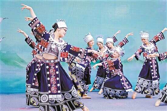身着民族服饰的舞者手持特色产品上台表演。 |