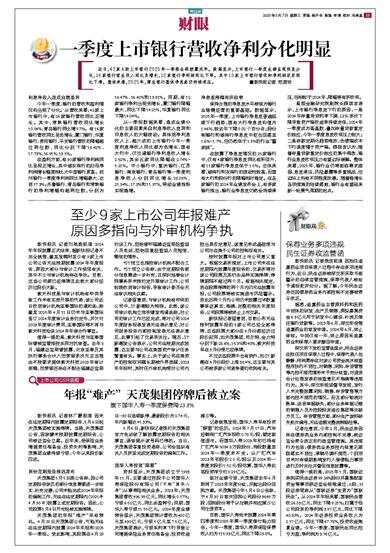 旗下国华人寿一季度保费降23.8% 新快报讯 记者林广豪报道 因未在法定期限内披露定期报告,5月6日起天茂集团被实施停牌。当晚,天茂集团公告,因涉嫌未按期披露定期报告,公司被证监会立案。近年来,受保险业务增提责任准备金、投资失利等影响,天茂集团业绩持续亏损,今年以来股价跌四成。 两份定期报告推迟发布 天茂集团5月5日晚公告称,因公司定期报告涉及的部分信息需要进一步核实、补充完善,公司未能完成2024年年报的编制工作,无法在法定期限内(2025年4月30日)披露上述定期报告。因此,公司股票5月6日开市起被实施停牌。 天茂集团的年报“难产”早有预兆。4月29日天茂集团公告,可能无法在法定期限内披露2024年年报和2025年一季报。受此影响,其股票在4月29日-30日连续跌停,最新股价为2.74元,年内跌幅达41.33%。 5月6日,新快报记者拨打天茂集团官方电话欲了解披露定期报告的相关事宜,语音提示该号码已停机。当日,天茂集团答复投资者称,公司会组织有关人员抓紧完成定期报告的编制工作。 国华人寿投资“踩雷” 资料显示,天茂集团成立于1993年11月,主要通过控股子公司国华人寿保险股份有限公司(下称“国华人寿”)从事寿险相关业务。2023年,天茂集团营收496.99亿元,同比增长0.17%;亏损6.52亿元,同比由盈转亏;同期,国华人寿亏损11.55亿元。2024年度业绩预告显示,天茂集团预计营收为400亿元至430亿元,亏损5亿元至7.5亿元。天茂集团表示,亏损系利率下行导致公司增提保险业务责任准备金、投资收益减少等。 记者梳理发现,国华人寿早有投资“踩雷”的经历。2024年7月17日,汽车经销商广汇汽车报收0.78元/股,锁定面值退市。而国华人寿2023年初已持有广汇汽车5084.8万股股份,持股数量至2024年一季度末不变。以广汇汽车2023年初股价2.1元/股以及2024年一季度末股价1.52元/股估算,国华人寿此笔投资浮亏约0.29亿元。 面对业绩亏损,天茂集团去年6月取消了2023年年度分红,并抛出股份回购方案。天茂集团今年5月6日公告称,于4月30日首次回购公司股份3649万股,回购股份将予以注销并相应减少公司注册资本。 目前,国华人寿尚未披露2024年第四季度和2025年第一季度偿付能力报告。今年一季度,国华人寿原保险保费收入约为115.93亿元,同比下降23.8%。