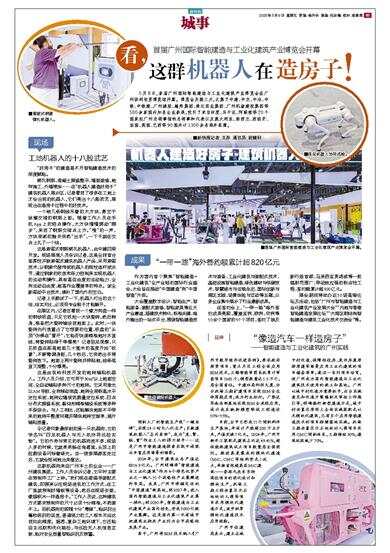 首届广州国际智能建造与工业化建筑产业博览会开幕 5月8日,首届广州国际智能建造与工业化建筑产业博览会在广州保利世贸博览馆开幕。博览会为期三天,汇集了中建、中交、中冶、中铁、中铁建、广州城投、越秀集团、珠江实业集团、广州机场建投集团等500余家国内知名企业参展,吸引了来自印度、乌干达、阿联酋等20个国家驻广州总领事馆的总领事和代表以及澳大利亚、新西兰、西班牙、法国、英国、巴西等90国共计1300余名海外客商。 ■新快报记者 王彤 通讯员 祝健轩 现场 工地机器人的十八般武艺 “好房子”的建造离不开智能建造技术的深度赋能。 绑扎钢筋、混凝土振捣整平、墙面装修、地坪施工、外墙喷涂……在“机器人建造好房子”建筑机器人展示区,记者看到了很多在工地上才会出现的机器人,它们亮出十八般武艺,展现出在造房子过程中的好技术。 一个被几条钢线吊着的大方块,悬空于纵横交错的钢筋上面。随着工作人员在手机App上的轻点操作,大方块慢慢挪动“脚步”,来到了钢筋交错点上方。“嗖”的一声,方块底部的触手突然“出手”,一下子就在交点上扎了一个结。 这是索驱式钢筋绑扎机器人,由中建四局开发。现场展演人员告诉记者,这是全球首台套柔性并联索驱式建筑机器人产品,采用索驱技术,以钢索代替传统机器人的刚性连杆或关节,通过钢索的收放和张力控制来实现机器人的运动和操作,具有高自由度的运动能力、全向运动自由度、超高作业覆盖率的特点。该全新驱动平台技术,填补了国内外的空白。 记者上手测试了一下,机器人打出的这个结,结实无比,必须用专业钳子才能解开。 在展区内,记者还看到一个像方向盘一样的钢铁吸盘,只见它吸起一大块瓷砖,然后转身,准备把大瓷砖铺设到地面上。此时,一块瓷砖先行放置占了它想要的位置,吸盘的“头顶”仿佛在“冒汗”:它能否快速精准地对齐直线,将瓷砖贴得干净漂亮?记者驻足观察,只见吸盘在距离地面几十厘米的高度开始“犹豫”,不断微调身躯,几十秒后,它突然出手将瓷砖放下。地面上两片瓷砖并排贴地,线条笔直又规整,十分漂亮。 这是由筑岭科技开发的地砖铺贴机器人。工作人员介绍,它可用于30m2以上地面空间,全自动铺贴多种尺寸的地砖。它采用激光SLAM导航、全向移动底盘、地砖全局标高水平定位系统、地砖边缝视觉测量定位系统、四点分布式振捣系统、黏结剂精准铺设系统等多种手段综合。与人工相比,还能解决地面不平带来的地砖平整度问题并降低地砖空鼓率,提升铺贴质量。 令记者印象最深刻的是一只机器狗,它的学名叫“四足机器人与无人机协同巡检实物”。它的外形与常见的机器狗差不多,现场人多的时候,它就乖乖躲在角落里,头顶上的检测设备闪烁着绿光。当一波参展游客走过后,它就会悠闲地出来溜达。 这款机器狗来自广州本土的企业——广州建筑集团。工作人员告诉记者,它平时主要在预制件工厂上钟。“我们现在都倡导装配式建筑,即摒弃以往现场浇筑的工作方式,在工厂里就预制好墙板等设备,然后在现场安装,像搭积木一样造房子。”工作人员说,这种建筑方式要求预制件的尺寸必须十分精准,不然装不上。而机器狗的眼睛十分“毒辣”,能识别出毫秒级别的误差,普通视力的工人根本无法达到如此精度。据悉,复杂工地环境下,它还能自主巡航和优化路径,与巡检无人机信息互联,能对安全质量智能识别及预警。 成果 “一带一路”海外签约额累计超820亿元 作为国内首个聚焦“智能建造+工业化建筑”全产业链的国际行业盛会,大会旨在推动“中国建造”向“中国智造”升级。 大会覆盖数字设计、智能生产、智能装备、装配式装修、智能家具等五大产业赛道,搭建技术转化、标准共建、海外输出的一站式平台,围绕智能建造技术与装备、工业化建筑与装配式技术、基础设施智能建造、绿色建材与低碳技术、智慧城市与运维生态、国际创新与湾区实践、场景体验与互动等主题,众多企业集中展示了行业最新成果。 在签约会上,“一带一路”海外签约成果亮眼,覆盖亚洲、欧洲、非洲等10余个国家的57个项目,签约了埃及新行政首都、马来西亚英诺威等一批辐射范围广、带动效应强的标志性工程,签约额累计超820亿元。 展会期间将举办近10场高端论坛及活动,包括“广州市智能建造与工业化建筑产业发展大会”“内地与香港智能建造发展论坛”“大湾区钢结构智能建造与建筑工业化技术交流会”等。 延伸 “像造汽车一样造房子” ——智能建造与工业化建筑的广州实践 预制工厂的智能生产线“一键启停”,实现24小时无人化生产;多款建筑机器人“各司其职”,成为“危、繁、脏、重”作业工人的得力助手……这是广州市智能建造探索实践中涌现出丰富应用场景的缩影。 2024年,全市建筑业总产值达8816.9亿元。广州明确将“智能建造与工业化建筑”作为4个特色优势产业之一纳入15个战略性产业集群进行布局。未来,广州市将锚定迈向“中国建造”新高地,到2027年,进入国内智能建造与工业化建筑产业第一梯队;到2030年,智能建造与工业化建筑产业国内领先,形成5000亿级产业集群。这是国内第一次有城市把建筑业相关产业列为全市战略性发展产业。 其中,广州将BIM技术纳入《广州市数字经济促进条例》,要求政府投资项目、