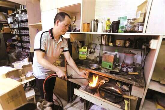 ▲廖叔把金水倒进炼金炉里。廖叔初中一毕业就开始学习打金。这门手艺是家族传承——从廖叔的外公到哥哥,再到廖叔,现在传给侄子。 |