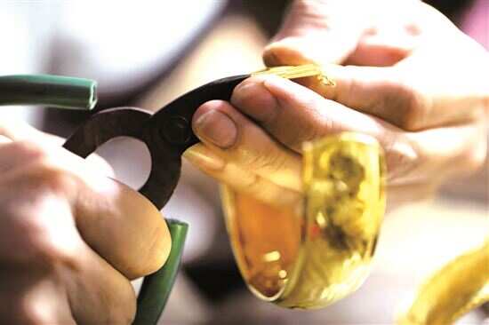 ■叮叮当当,叮叮当当,在这块历史悠久的敲金石上,金条被廖叔敲打成扁扁的长条,再用精准的火候焊接成环。 |
