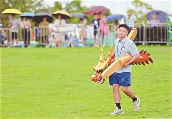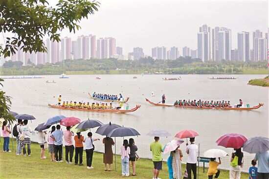 27支队伍参赛,现场观众达1万人次 新快报讯 记者李应华 通讯员杨文强报道 近日,“穗城源”第三届九龙湖龙舟邀请赛在广州市黄埔区龙湖街道激情开赛。本次活动共有27支龙舟队伍参赛,虽然现场伴有阵雨,但观众依旧热情不减,众多居民组团前来观看,数据显示,当天现场观众达1万人次,线上直播观看观众累计超10万人次,赛事期间周边商圈客流量激增200%,“跟着龙舟游知识城”正成为湾区文旅新时尚。 九龙湖畔,随着锣鼓声起,一支支龙舟队如离弦之箭,向终点发起冲刺,观众席响起阵阵加油呐喊声。值得关注的是,赛事举办地一旁,是距今已有四千余年的陂头岭遗址。飞速向前划过的龙舟,静静安坐的陂头岭遗址,仿佛实现了一场穿越时空的对话,历史遗迹得到完好保存,古老传统的赛龙舟习俗在现代得到传承与发扬,焕发生机活力。 张先生是知识城一家企业的员工,他表示,很喜欢知识城的环境,今年各种文化活动也越来越多,当得知要举办龙舟赛,他毅然选择报名。“因为平时要上班,大家都是抽空来训练,今天比赛大家都很努力,不管结果如何,大家都尽力了,开心就好”,张先生兴奋地和队友领取主办方发放的奖品“烤乳猪”。当天虽然天公不作美,但依然吸引众多市民前来观赛。 本届活动较以往进行了全面升级,赛事期间,除了激动人心的龙舟比赛,还有“到黄埔去”音乐季、九龙湖房企车企展、非遗表演、创意集市、亲子龙舟赛、水上表演等特色配套系列活动。推出“白天可以逛、晚上可以玩”模式,让市民在休闲中就能感受到传统文化的魅力。 本届赛事恰逢全运会筹备关键期,体育热正悄然兴起。黄埔区龙湖街道办事处主任杨吉龙表示,希望借助龙舟这一传统体育载体,将“体育+文化+旅游”深度融合,通过打造集竞技、文化、亲子、消费等多元体验于一体的龙舟文化节,不仅激发市民健身热情,更推动水经济、城市形象和文化软实力的协同发展,助力中新知识城构建具有辨识度的城市品牌。