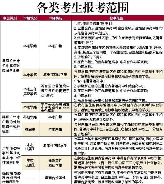 注: 1.省、市属普通高中:华南师范大学附属中学、广东实验中学、广东广雅中学、广州市执信中学、广州市第二中学、广州市第六中学、广州市铁一中学、广州大学附属中学、广州协和学校、广东华侨中学、广州市艺术中学、广州外国语学校、清华附中湾区学校。具体学校名单以《报考指南》为准。 2.区属公办示范性普通高中和经批准可面向外区招生的引入优质教育资源新建的区属普通高中:区属公办示范性普通高中面向本区招生,但每所区属公办示范性普通高中原则上可将不超过15%的招生计划面向外区招生;南沙区等部分普通高中学位供给相对宽裕的区,区属公办示范性普通高中经市教育局批准,可将不超过25%的招生计划面向外区招生;在非中心城区,引入省内外优质教育资源新建的区属普通高中,经市教育局批准后,可将部分招生计划面向全市招生,具体比例由各区根据实际情况申请。具体学校名单详见《报考指南》。 3.符合公办普通高中报考条件的随迁子女:省、市属和各区公办普通高中招收非政策性照顾的非广州市户籍初中毕业生的计划为该校当年招生计划的8%至18%。区属公办普通高中的具体比例由各区根据实际情况确定,省市属公办普通高中的具体比例由学校自行确定。公办普通高中投档时,非政策性照顾的非广州市户籍初中毕业生与户籍生同时投档录取,其录取人数不超过其最大计划数。 4.符合名额分配报考资格的考生,按其学籍所在区填报名额分配志愿,可填报名额分配到本校的普通高中学校志愿。 5.往届生不可报考特长生、自主招生、名额分配和中职三二分段专业计划。 6.以上内容如有变动,以最新通知为准。