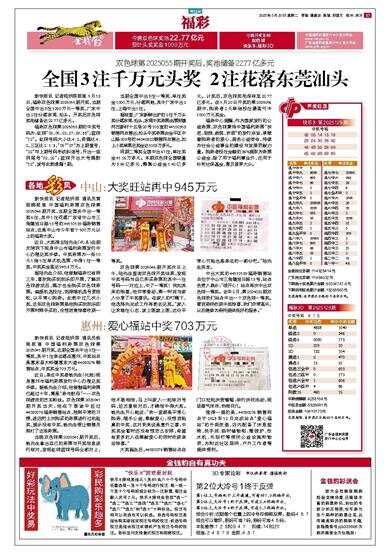 新快报讯 记者陆妍思 通讯员黄丽娜报道 中国福利彩票双色球第2025046期开奖,当期全国共中出一等奖6注,其中1注花落广东省中山市三角镇旭日路18号的44110189福彩销售站点,这是中山市今