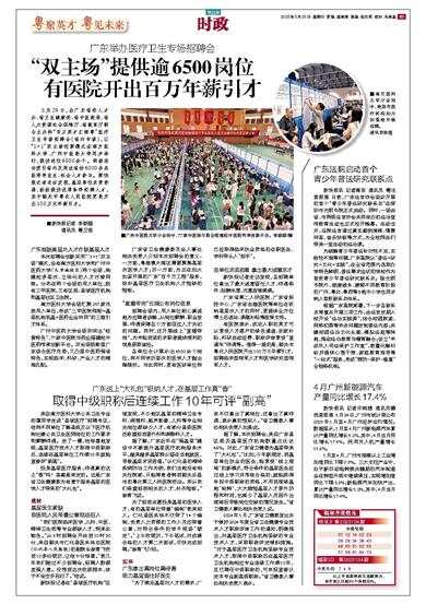 广东举办医疗卫生专场招聘会 5月24日,由广东省委人才办、省卫生健康委、省中医药局、省人力资源社会保障厅、省教育厅联合主办的“百万英才汇南粤”医疗卫生专场招聘会(省内专场),以“1+1”双主场创新模式在南方医科大学、广州中医药大学同步举行,提供岗位6500余个。两场活动吸引省内及周边省份6000多名医学毕业生、社会人才参与。新快报记者走访发现,基层单位求贤若渴,纷纷提供优厚条件招聘人才,其中韶关市粤北人民医院更是开出100万元年薪引才。 ■新快报记者 李斯璐 通讯员 粤卫信 广东既缺高层次人才亦缺基层人才 本次招聘会创新采用“‘1+1’双主场”模式,设有南方医科大学和广州中医药大学(大学城校区)两个会场,构建起多层次、立体化的人才对接网络。分布在两个会场的用人单位,既有三甲医院,又有区级、县域医疗机构和基层社区卫生院。 南方医科大学会场汇聚257家优质用人单位,形成“三甲医院领衔+基层机构筑基+医药企业协同”的三维引才体系。 广州中医药大学会场则突出“岐黄特色”,77家中医院与药企搭建起中医药传承创新平台。双会场既彰显广东综合医疗优势,又凸显中医药强省特色,实现临床、科研、产业人才的精准匹配。 广东省卫生健康委员会人事处相关负责人介绍本次招聘会的意义:一方面,粤港澳大湾区需要聚集高层次医学人才;另一方面,为正在如火如荼开展的广东“百千万工程”服务,弥补基层医疗卫生机构人才短缺的短板。 “直播带岗”云端公布岗位信息 招聘会场内,用人单位耐心真诚地为应聘者讲解,从岗位薪酬、职业发展、待遇保障各个方面回应人才关切的问题。同时,还开展线上“直播带岗”,为未能到场的求职者提供便利的信息获取途径。 各单位合计展示出6500余个岗位,向不同学历层次的医学人才抛出橄榄枝。与此同时,更有医研单位向已经取得临床执业资格的在职医生、学科带头人“招手”。 各单位求贤若渴 拿出最大诚意求才 新快报记者走访发现,各招聘单位拿出了最大诚意留住人才,待遇条件、报酬丰厚,优惠政策满满。 广东省第二人民医院、广东省疾控中心、广东省生殖医院等单位在吸纳高层次人才的同时,更提供全方位博士后进站、课题补贴等政策支持。 有医院表示,成功入职的英才可以享受人才落户的绿色通道、安家补贴、科研启动经费、职称评审享受“直通车”待遇等。值得一提的是,韶关市粤北人民医院开出100万元年薪引才,招聘临床型领军人才和医学研究型领军人才。 广东送上“大礼包”吸纳人才,在基层工作真“香” 取得中级职称后连续工作10年可评“副高” 来自南方医科大学公共卫生专业的谭同学走进“县域医疗”招聘专区,他向不同单位了解县级及以下医疗机构社康公共卫生医师岗位的工作要求和薪酬待遇。走了一圈,他惊喜地发现,基层医疗技术人才取得中级职称后,连续在基层单位工作满10年就能直接评“副高”。 投身基层医疗服务,待遇真的这么“香”吗?答案是肯定的。这是广东省卫生健康委为有意于服务基层的医学人才带来的“大礼包”。 现状 基层医生紧缺 有医院人员带着公章现场招人 “我们医院临床医学、儿科、中医、精神卫生类等专业都缺人才,特来此物色。”从9时招聘会开始到10时30分,来自韶关市仁化县医共体总医院(仁化县人民医院)的副院长徐育飞收到10多份简历,让他十分惊喜。“前几年我们跑过不少招聘会,招聘人数都差强人意。没想到这次收获颇丰,终于不会空手而归了。”他说。 新快报记者在“县域医疗机构”区域发现,不少地区基层的精神卫生专科、病理科、超声影像、儿科等专业相关岗位都缺少人才,有部分县级医院还希望招到普外科和麻醉科人才。 据了解,广东近年在“强基层”建设中不断提升基层医疗机构服务水平,越来越多基层群众留在当地就医,导致基层求贤若渴。“以仁化县的精神疾病防治工作为例,我们当地没有相关住院部,只能将患者转到韶关乐昌市的粤北第三人民医院收治。所以我们希望招到相关的人才,补齐短板。”徐育飞说。 为了招到志愿投身基层的医学人才,有的基层单位带着“编制”前来招人。仁化县医共体不仅带了14个编制,负责人力资源的工作人员还带着公章,对符合条件的学子现场“锁定”。“上午收简历,下午笔试,对成绩合格的人才第二天面试,尽快完成招聘。”徐育飞介绍。 实举 广东拿出真岗位真待遇 助力基层留住好医生 “为了满足基层对人才的需求,广东不仅拿出了真岗位,还拿出了真待遇,表示真的想招人。”省卫健委人事处相关负责人如是说。 据了解,本次招聘会,来自广东县区级及基层医疗机构数量占比达66%。对此,广东省卫健委为基层带来了“大礼包”。“比如,今年新规定,到基层单位执业的医生,能享受‘线上规培’的新模式,符合条件的基层医生经过线上学习并考核合格的,就能获得申报中级职称的资格,不用到规培基地‘轮转’,大大缩短基层人才晋升历程和时间,也减少了基层人员因外出规培而导致岗位空缺的情况发生。”省卫健委人事处相关负责人说。 2024年1月,广东省卫健委发出关于做好2024年度全省卫生健康专业技术人才职称评审工作的通知,明确指出,对基层医疗卫生机构紧缺的专业技术人才,采取职称评定倾斜措施。“对于基层医疗卫生机构紧缺专业