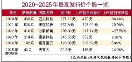 5月26日至30日,今年A股市场发行价第二高的创业板新股优优绿能实行申购,价格为89.6元/股,仅次于4月份上市的新股天有为93.5元/股的发行价。新快报记者注意到,虽然这已是年内数一数二的高发行价,但今年以来,新股的最高发行价没有超过100元/股的。近几年,A股不但IPO数量在逐年减少,而且新股最高发行价也在逐年降低,2021年的新股最高发行价是禾迈股份的557.8元/股,而2024年新股最高价是诺瓦星云的126元/股。 ■新快报记者 涂波 最贵新股股价较高点跌近九成 5月26日,电力设备新股优优绿能开启申购,发行价为89.6元/股,发行市盈率15.37倍,低于同行业水平,这是年内发行价第二高的新股。但比起过去几年的新股发行价来说,可谓小巫见大巫。 2021年的新股最高发行价是禾迈股份的557.8元/股,也是迄今为止A股发行价最高的个股,保荐机构为中信证券。禾迈股份原计划募资5.58亿元,实际募资55.78亿元,超募达50亿元。2022年9月,禾迈股份曾一度上涨至1877.43元/股,较发行价涨超200%。但触顶而落,禾迈股份股价随后一路下行,业绩也迅速变脸。2023年和2024年,其净利润同比分别下滑3.89%、32.8%。2025年一季度,净利润更是同比下滑115.39%,由盈转亏。昨日该股收报100.93元/股,与历史最高价比,跌幅近90%。 记者统计发现,2021年新股发行价触及历史高位后,2022年至今每年新股最高发行价都在下降。2022年万润新能发行价为299.88元/股,为当年新股最高,但上市当天破发,跌幅近28%。此后,万润新能的股票一路下挫,昨日收报36.9元/股,与最高位相比跌幅超85%。上市后万润新能业绩出现严重下跌,2022年至2024年净利润分别为9.59亿元、-15亿元、-8.70亿元,2025年一季度净利润为-1.56亿元。 2023年索辰科技以245.56元/股的发行价成为当年冠军。索辰科技2024年净利润4156.85万元,同比下降27.68%。前不久,索辰科技发布了筹划重大资产重组的进展公告,股价有所回暖。昨日收报79元/股,与上市即巅峰的最高价301.79元/股相比,跌幅超七成。 2024年,以126.89元/股“出道”的诺瓦星云坐上当年新股最高发行价宝座,8月一度涨至508元/股,随后下跌,昨日最新收报139.79元/股,按后复权价计算,较最高点跌近50%。 新股发行定价逐步回归理性 从近年新股上市首日涨幅来看,2020年至2024年,新股首日涨幅超100%的股票数量分别为152只、249只、24只、60只和75只。 其中,2020年上市的康泰医学首日股价最高涨幅近3000%,这家发行价仅为10.16元/股的医疗器械公司,当天最高涨至308元/股,收盘价为118元/股。不过,出道即巅峰,该股此后持续跌了四年,5月26日最新收报14.01元/股,五年间市值蒸发95%。在公司股价低迷时,有多位高管以及部分股东套现离场。 2021年至2024年,读客文化、快可电子、盟固利和红四方分别获得当年上市首日涨幅冠军。但最新报价与最高价相比,都已“不可同日而语”。例如快可电子,股价从最高的144元跌到如今的32元左右。 分析认为,2023年全面注册制实施后,新股发行定价逐步回归理性,市场化水平提升,估值定价更合理。投行人士王骥跃表示:“市场有自我调节机制,之前新股一直赚钱,报价就会乐观;破发出现后,报价就会谨慎。”中国资本市场对融资企业要求越来越高,从源头上把好上市公司质量第一关。这也可能在一定程度上影响了新股发行的数量和价格。