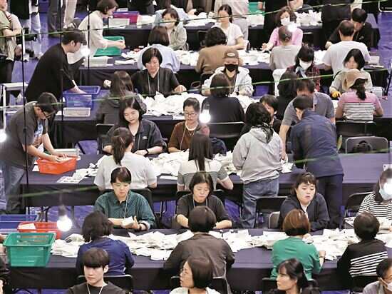 6月3日晚,工作人员在韩国首尔一处计票站计票。 新华社发 |