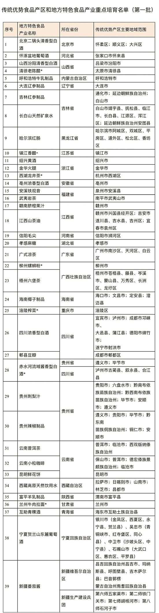 4日,我国发布首批传统优势食品产区和地方特色食品产业重点培育名单(见下表),包括云南小粒咖啡、西湖龙井茶等39个重点培育对象。 据了解,此次发布的首批重点培育对象,分布在我国28个省份,涵盖乳制品制造、饮料制造、酿酒工业、精制茶制造等食品工业主要门类。数据显示,目前,我国特色食品产区达450余个,产业规模超2.5万亿元,我国已成为全球食品工业第一大国,行业规模约9.8万亿元。(来源:新华社) 注:标*地方特色食品产业已纳入工业和信息化部“首批中国消费名品名单”。