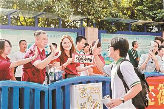 8日,高考进入第二天。考点外,仍有不少家长默默守候。有父子二人穿上绿色T恤送考,有好友举着向日葵为考生加油打气。还有家长向新快报记者分享了自家的备考故事,认为孩子感受到家长的陪伴,会更有安全感,更有底气。考场内,各个考点全力做好各项考务工作,助力考生安心赴考。 亲友团花式送考 愿考生一举夺魁 6月8日一大早,小秦就跟着爸爸来到广雅中学考点门口为哥哥送考。父子二人特意穿上了绿色的T恤寓意“一路绿灯”,T恤上印着“科科满分”,吸睛又应景。小秦向记者展示完送考T恤后,不忘为哥哥送上祝福:“祝哥哥考试顺利,金榜题名!” “三年的时光不容易,希望孩子们可以考一个好的学校,展开人生的新篇章。”从浙江赶过来陪考的家长吴先生早早来到华附考点外等候,特意穿着印有“金榜题名”的红色T恤,为孩子送上祝福。接受新快报记者采访时,他表示:“孩子以后会闯出自己的世界,家长能陪伴的时间也会越来越少,所以高考这几天我希望能好好陪一下孩子。” 记者观察到,今年的送考队伍中,绽放的向日葵花束格外显眼。徐同学连续两天携一束向日葵,在广州市第六中学考点外等候朋友离场。她告诉记者:“第一天,我只带了一株向日葵,今天带了六株,寓意六六大顺,明天要再翻倍送十二株,预祝她一举夺魁。”每日递增的向日葵花数,也是独属于她们的仪式感,“想让她每天都更多点期待,希望她放平心态。等考试结束,我们就一起去水上乐园玩!” 广州市第六中学考点外,高温下,徐同学身穿一身cos服在送考队伍当中显得十分亮眼。她和今年参加高考的朋友因所cos的角色相识,“今天也想给她个惊喜,祝她高考顺利。” 家长陪伴张弛有度 搭配膳食注重健康 高考是牵动万千家庭的一场重要考试。广州市第七中学学生家长朱女士告诉记者,为了保证孩子考试期间的饮食,她每天亲自为孩子下厨,“不求多特别,就是保证食物新鲜、熟透,不让孩子在考试时因肠胃不适分心。”朱女士说。 在菜谱安排上,朱女士既照顾孩子喜爱酸甜口味的饮食习惯,也注重营养搭配。比如,考试第一天,准备了羊肚菌排骨鸡汤、西红柿炖牛腩;考试第二天则有西洋参鸽子汤,还搭配核桃、花生等食材。 回看孩子高三这一年,朱女士始终秉持着“张弛有度”的陪伴原则。朱女士表示,在备考过程中,作为家长自然会关注孩子的成绩,但她会根据孩子的情绪状态调整关心的方式。孩子愿意交流时,她就耐心倾听;孩子不愿多谈时,她也不过多追问,给孩子足够的空间自我消化、自我化解,以免影响孩子的心态。 谈及后续选专业与院校的问题,朱女士坦言,希望孩子能报考广东省内的高校。在院校和专业选择上,朱女士表示会和孩子充分沟通,以就业为导向,同时兼顾院校综合实力进行考量。如果孩子分数较高,但省内又没有合适的专业院校的话,也会考虑省外的高校。“考完后不管结果怎么样,我觉得都无所谓,因为她已经努力过了。”朱女士说道,即便孩子高考结果不如意也没有关系,因为高考不是终点,而是成长的转折点。 父母默默加油陪考 不给压力只给鼓励 “我们三天都会在这守着,孩子进考场、出考场都会看到我们,感受到我们的陪伴,会更有安全感,更有底气。”在广州奥林匹克中学考点外,记者注意到家长吴先生和太太连续两天都准时来陪考。吴先生告诉新快报记者,自己是湖南籍住在白云区,高考三天在考点附近订了酒店陪考。“我们平时都比较忙,但这三天会把手头的事情都放下,全力陪考,虽然也做不了什么,就是默默加油吧。”他坦言,自己学历不高,高中三年也给不了孩子多少帮助,但只要孩子有需要,就会努力去达成孩子的愿望。“最后一年,他说不想住校,要个安静一点的环境复习,我们就在学校附近给他租了公寓,每个周末,妈妈变着花样给他做好吃的,孩子也懂事自律,高三这一年,过得还算平稳。” 说到对孩子的期待,吴先生直言,无论是考前还是考后都不希望给他压力,“高考是人生的一个重要节点,不是终点,不管考得怎样,我们都接受,只给他鼓励,不给他压力。”他笑说,自己很早就和家里人说好“不啰嗦,不说教”,“他需要我们,我们就陪,但不懂的就别问,没考好也不要指责。” 特 写 考点严格落实安检要求 提供暖心服务护航高考 今年高考,广东继续实行“2+1”安检模式,即考生进入考场须经过“2次金属探测仪(考点考试封闭区入口、考场入口各1次)+1次智能安检门(考点考试封闭区入口安检通道)”检测。 6月7日,新快报记者在广东外语外贸大学实验中学(以下简称“广外实验中学”)体验了一次高考安检。第一步是双脚站上黄色的金属探测仪,该仪器和体重秤外观类似,检测到鞋子带有金属将在仪器中间的屏幕显示。第二步是经过考场安检员的手持金属探测仪的检测,有点类似地铁安检员的手持探测设备。如果探测到金属,考场安检员会进行物品的检查。第三步则是考生携带物品通过安检门,此时身上的金属设备都会显示在安检门上方的屏幕里。考场安检员会要求被安检门预警的学生来到安检通道旁进行复检。每名考生在进入考场教室前,还会有一次金属探测仪安检。 在考生进入安检前的准备区域,记者看到几个物资箱被整齐摆放在显眼位置,物资箱内文具、雨衣、拖鞋、毛巾等应急物资一应俱全。广外实验中学副校长、考点副主考冯永滔介绍,像这样的