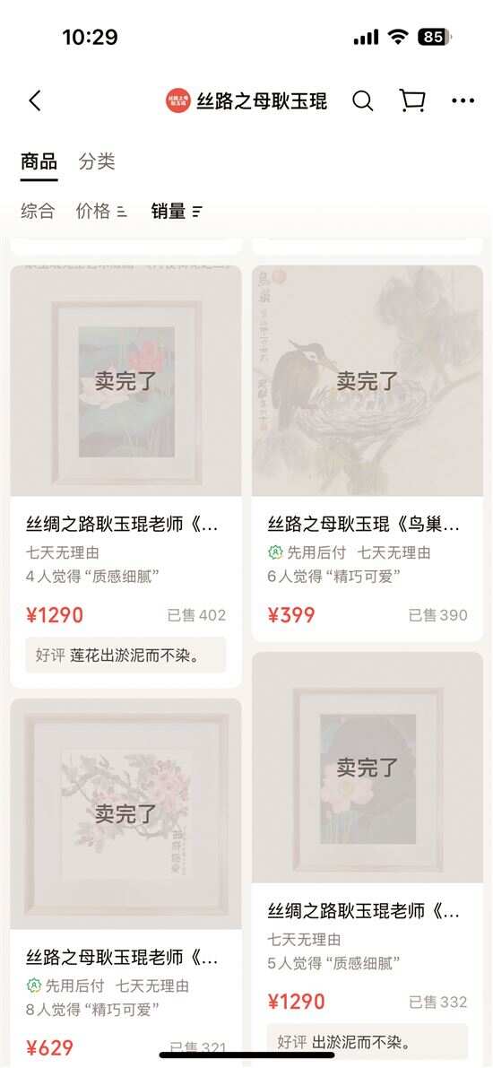 ■标价为299元的丝路之母耿玉琨《牡丹蝶梦》 宣纸 显示“销售286件 已卖完”。 |