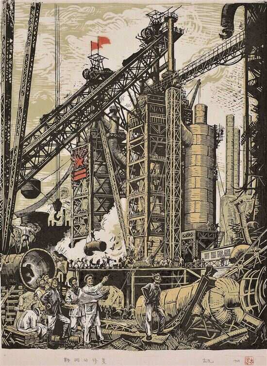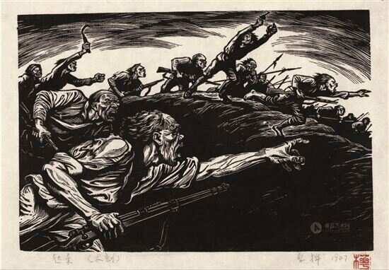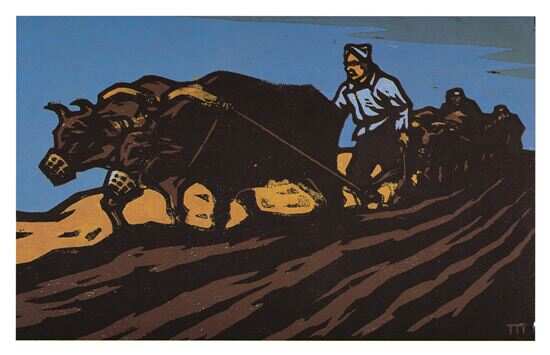 ■胡一川 《牛犋变工》 套色木刻版画 |