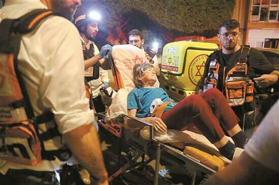■6月15日,在以色列特拉维夫南部巴特亚姆地区,救援人员转移伤员。新华社发 |