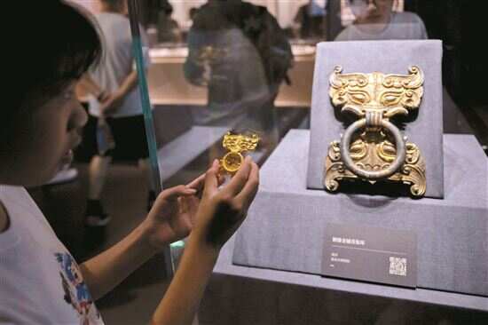 6月15日,在上海市闵行区博物馆,小朋友手持购买的文创产品在铜鎏金铺首衔环前比对。 当日,“楚风烈——安徽楚文化文物精品展”在上海市闵行区博物馆开幕。 新华社发