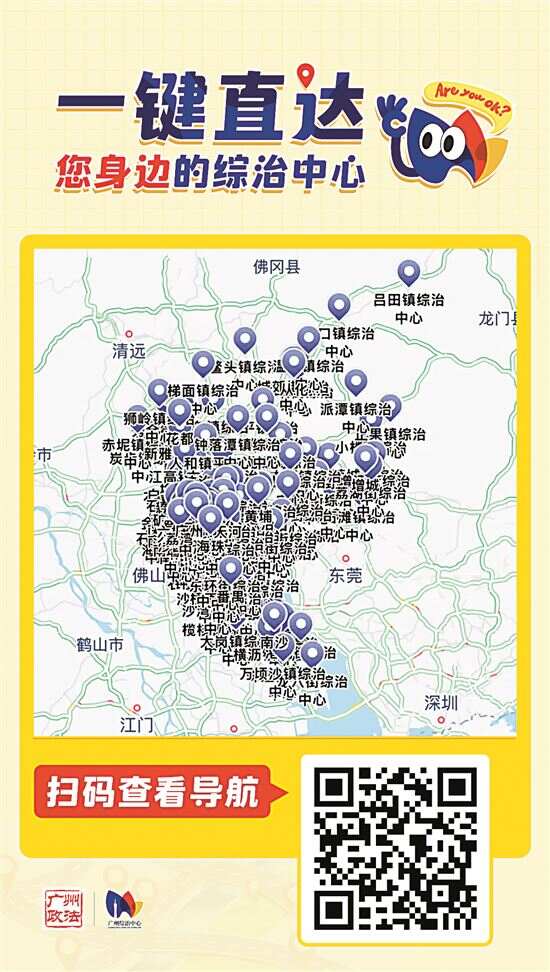 ■广州市委政法委上线了全市11个区级综治中心,以及177个镇(街)综治中心的精准导航信息,市民们只要动动手指,就能实现“一键直达”。通讯员供图 |