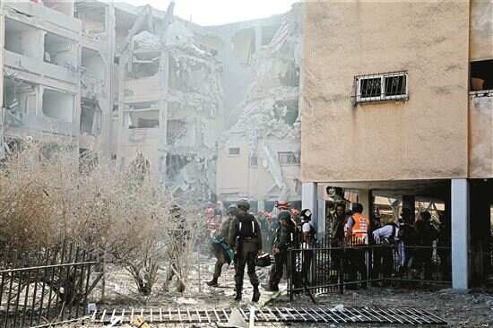 ■6月19日,应急和救援人员在以色列中部霍隆的导弹袭击现场开展工作。新华社发 |
