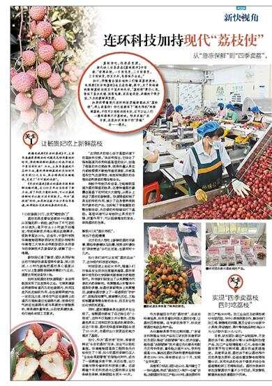 从“急冻保鲜”到“四季卖荔”,广东科研人员接连攻克荔枝采摘、保鲜、销售系列难题 荔枝好吃,但容易变质。唐代诗人白居易在《荔枝图序》中写道:“若离本枝,一日而色变,二日而香变,三日而味变,四