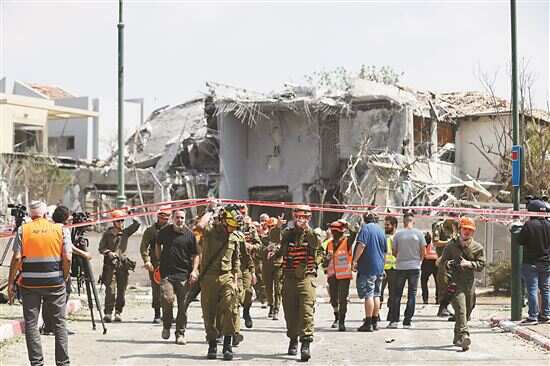 ■6月22日,应急和救援人员在以色列中部内斯齐约纳的导弹袭击现场开展工作。新华社发 |