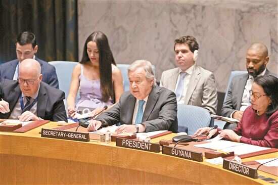 ■6月22日,在位于纽约的联合国总部,联合国秘书长古特雷斯(前中)在安理会就美国打击伊朗核设施召开的紧急公开会上发言。 新华社发 |