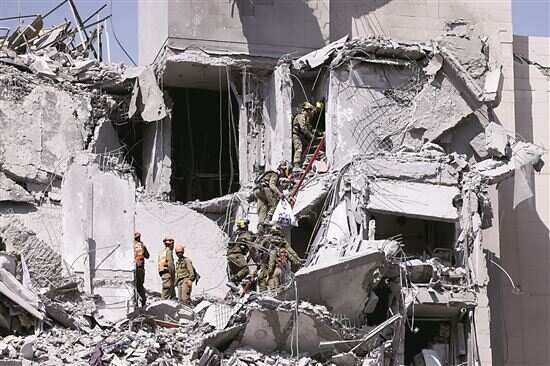■6月24日,应急和救援人员在以色列南部贝尔谢巴的导弹袭击现场开展工作。新华社发 |